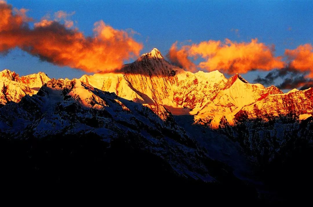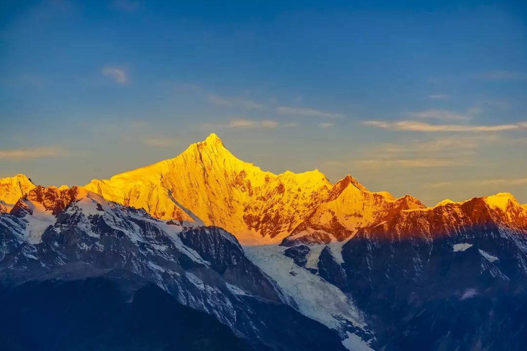 当红日跃出云霞的一刹那,雪山沐浴在金光下,熠熠发光。