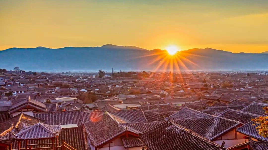 日出时,太阳首先照在玉龙雪山上,然后整个古城沐浴在温暖的阳光下。 阳光普照大地,一扫所有的忧愁。