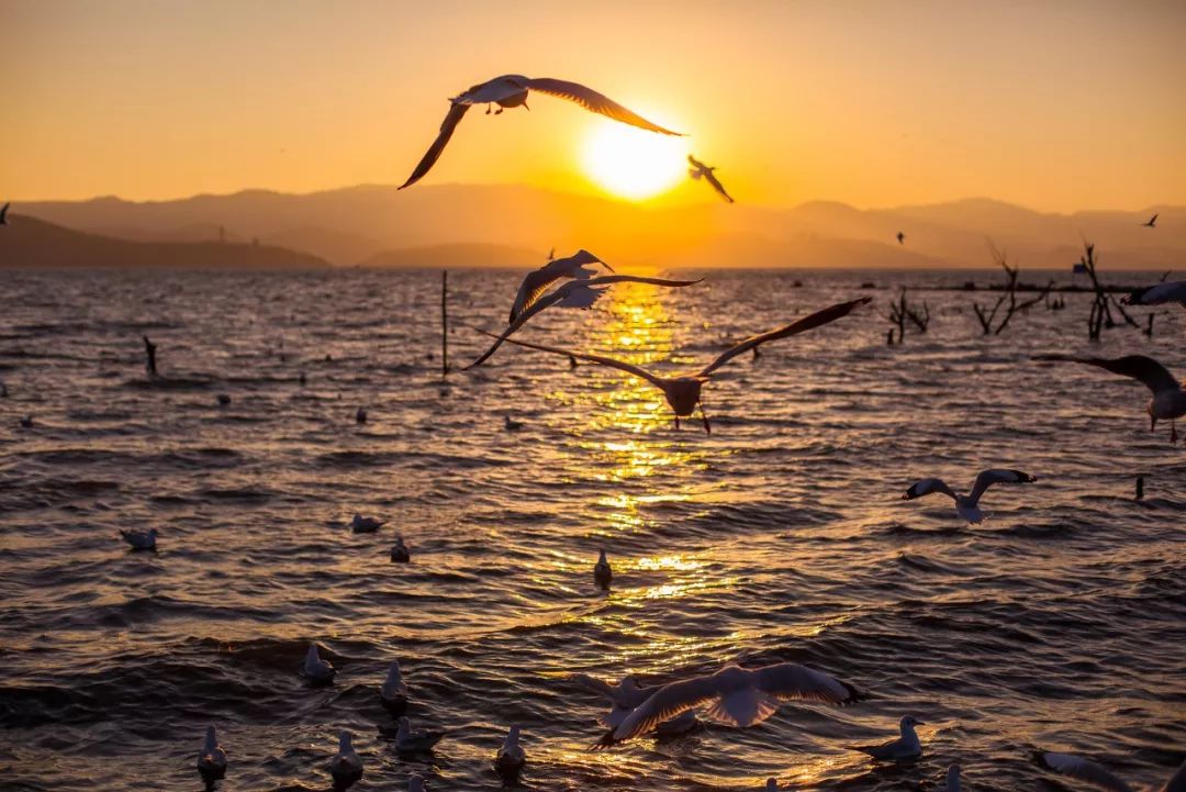 远处一朵云摇曳着金红色婆娑在滇池的尽头,霞光将湖面染成金黄,稍微有些刺眼,海鸥们陆续出来觅食。