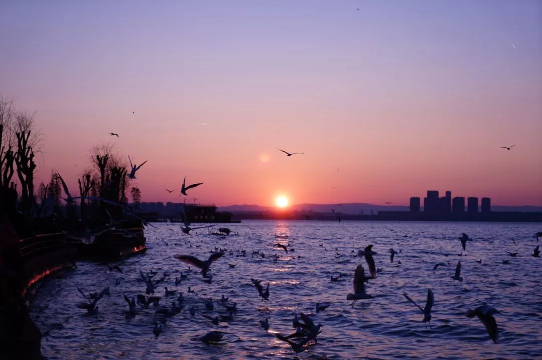 湖面是粼粼的波光和成群结队的红嘴鸥,远方的天空是金黄、橙黄,一切美的如童话一般。