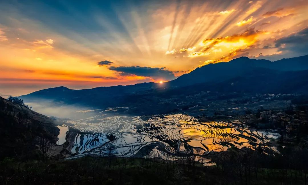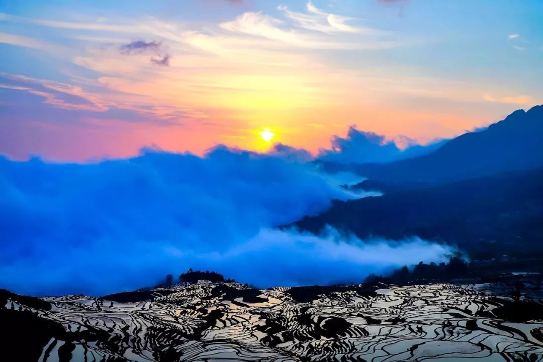 这儿有金色的云彩、云海,白雾笼罩着梯田,太阳悄悄从厚雾中钻出来,马上就产生了霞光万丈的奇观,变幻无穷。