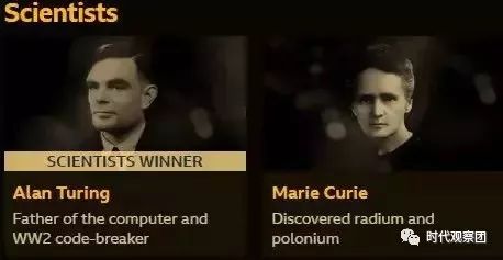 在1月14日公布的科学家篇名单中,中国首位诺贝尔生理学或医学奖得主屠呦呦与物理学家居里夫人(Maria Curie)、物理学家爱因斯坦(Albert Einstein)以及数学家艾伦•图灵(Alan Turing)共同进入候选人名单。