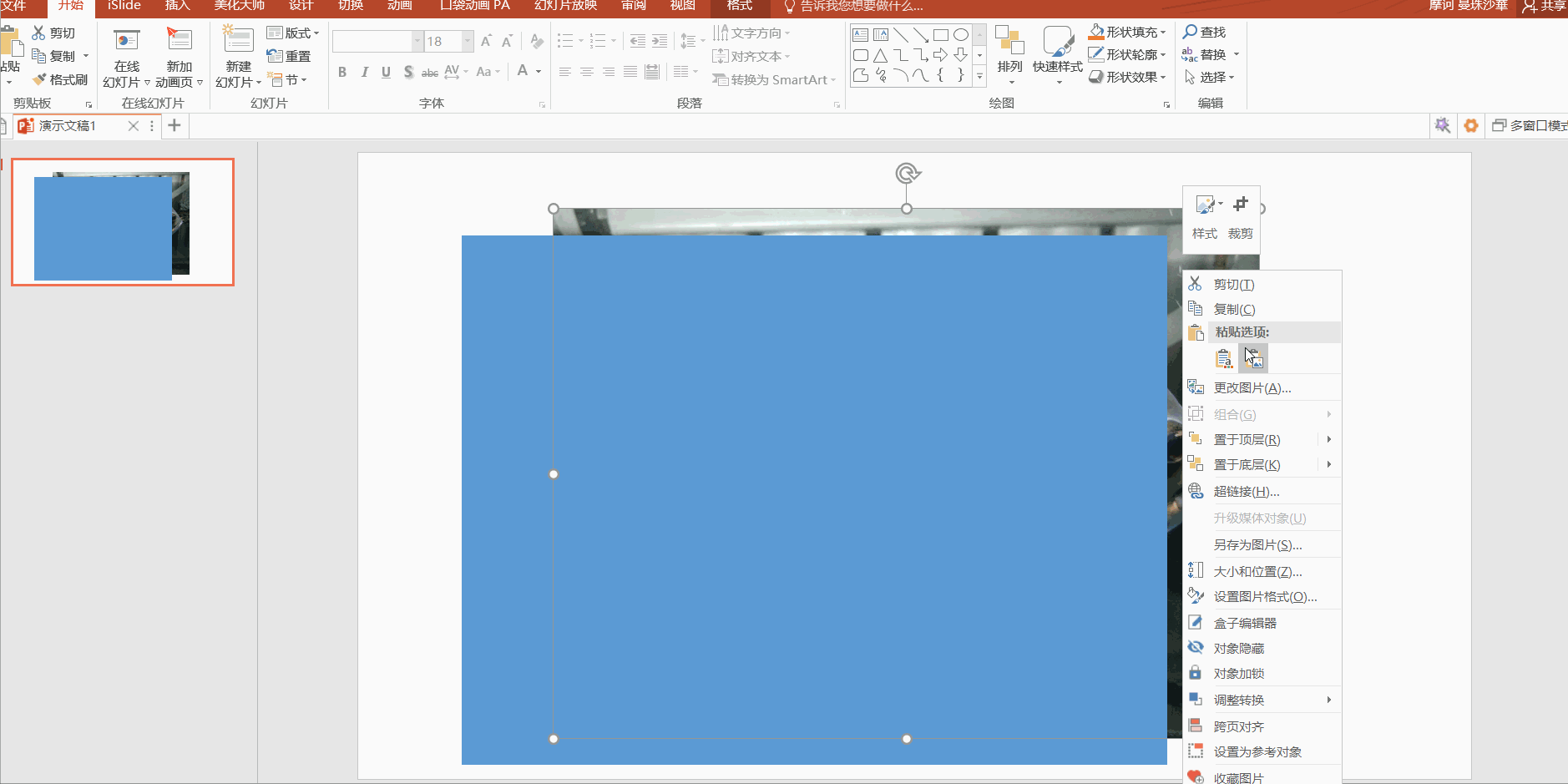 右键将图片剪切,或者快捷键ctrl+x,然后选中矩形,右键选择“设置形状格式”,点击”图片或纹理填充”,选择来自“剪贴板”,此时矩形便被图片填充。