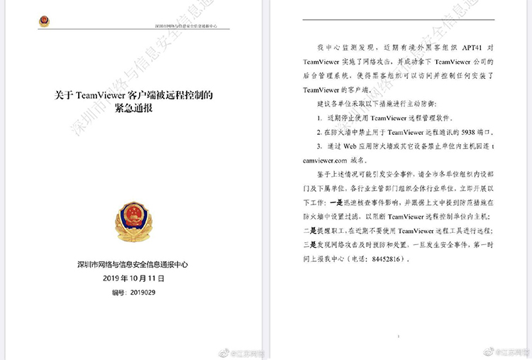 今天网络安全方面有条紧急情况,江苏网警在微博上发布公告,深圳市网络与信息安全信息通报中心不久前发布了《关于 TeamViewer 客户端被远程控制的紧急通报》,通报表示近期有境外黑客组织APT41 对 远程控制软件TeamViewer 实施了网络攻击,并已成功地拿下了该软件的管理后台。