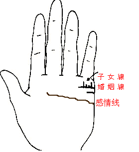 手掌中的子女线是长在婚姻线上方的竖线。在女生的手纹更明显。如果一个男人深深地爱着自己的子女,那线条就很清楚。如果子女线平直而深,会生健康的孩子。如果线路不清晰而弯曲,子女会很瘦弱,很容易生病。