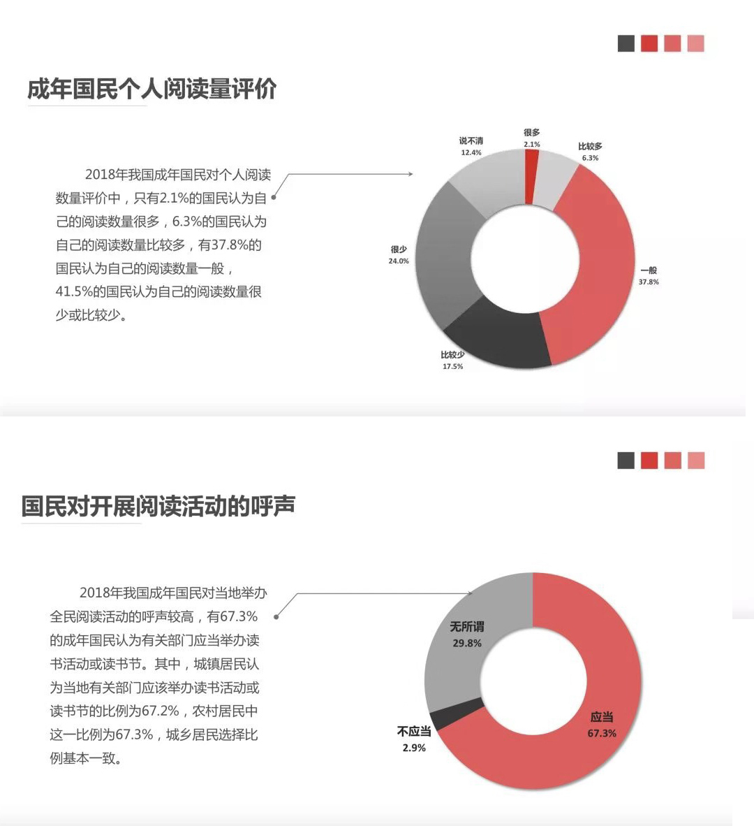 根据中国新闻出版研究院发布的《第十六次全国国民阅读调查结果》显示:2018年我国成年国民对个人阅读数量评价中,41.5%的国民认为自己的阅读数量很少或比较少,67.3%的成年国民认为有关部门应当举办读书活动或读书节。看来大家并非不爱读书,而是期盼有更好的阅读活动和阅读环境。