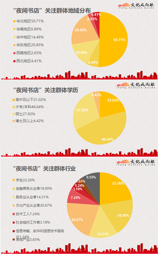 根据凤凰网《文化风向标》的调研:地域分布上,最关注“夜间书店”的人群超过51%生活在华北地区,位于华东与华中地区的关注人群占比则分别为21%、14%,这一结果与夜间经济带的地理分布高度重合;学历分布上,关注“夜间书店”的“不眠人群”中,32%学历达到硕士和博士及以上,47%为大专或本科学历;行业分布上,关心“夜间书店”的用户以在读学生、文化产业从业者和金融商务从业者居多,三者的数据综合已经超过了全部问卷回应受众的60%。