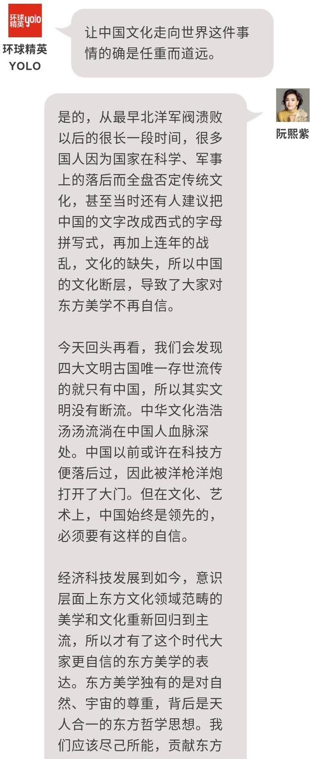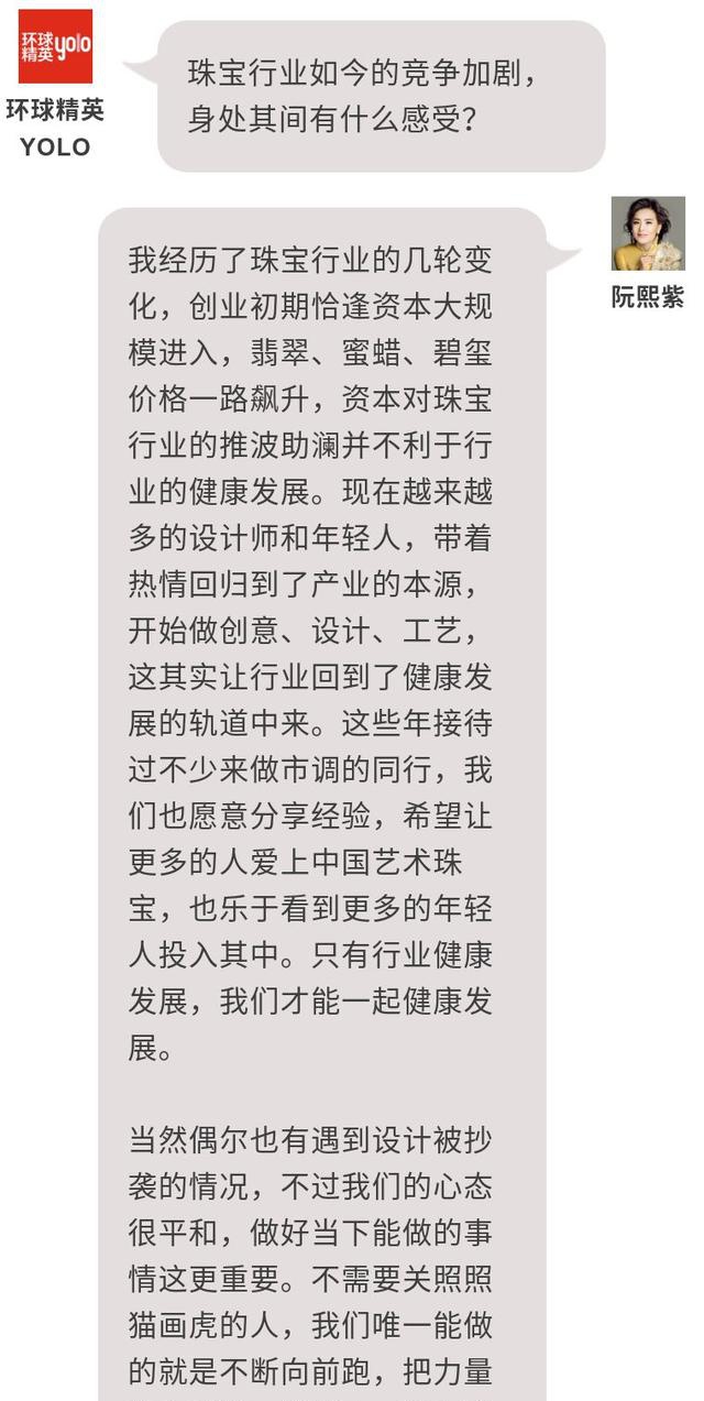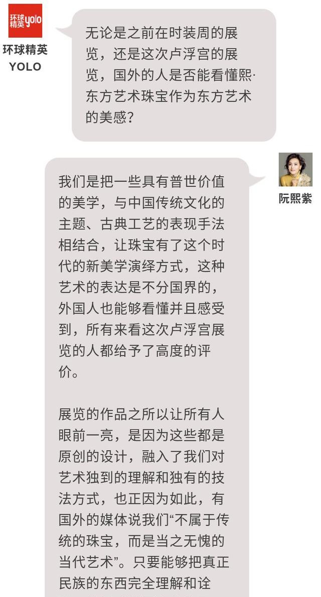 而且在阮熙紫看来,“中国有那么多值得骄傲的东西,尽管中国传统文化和中国传统手工艺的传承有断层,但只要把这个断层链接上,以不断的创新理念赋予这些传统手工艺新的生命,它们就能很好地发展下去。”她相信,在世界舞台上,未来一定需要东方的璀璨,“中国人一定能实现我们自己的愿景”。