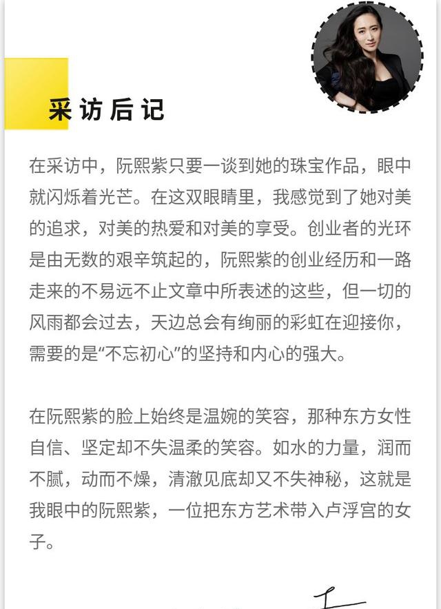 艺术和商业之间是有矛盾的,艺术需要花时间去精雕细琢,而商业的本质考虑的是利润率、回报速度,希望尽快见到收益。在阮熙紫看来,很多东西不是通过物质来衡量的。她真正引以为傲的,是熙·东方艺术珠宝这些年做了几千件作品,75%都被客人青睐和收藏;是她培养了一批又一批设计出众、技艺精良的优秀团队;是所有的展览都能够获得众口一词的好评。