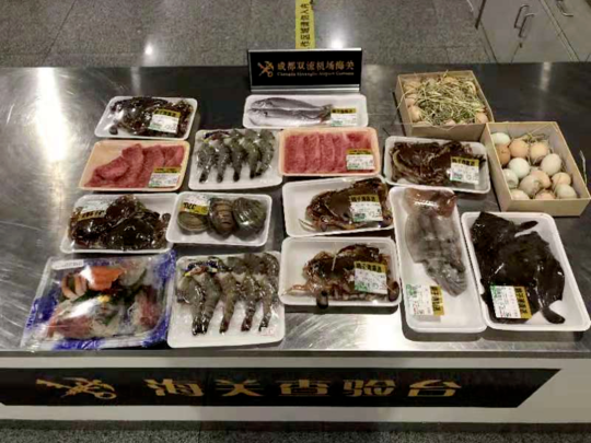成都海关介绍,根据《中华人民共和国禁止携带、邮寄进境的动植物及其产品名录》规定,(生或熟)肉类(含脏器类)、蛋类及其制品,属于禁止携带、邮寄进境物,不论何种包装形式、烹饪程度的肉类及其制品未经检疫都不允许携带、邮寄进境。未经检验检疫的海鲜产品,可能存在有寄生虫、真菌、细菌等多种病原生物,潜藏着极大的风险,危害农副产业、公共卫生安全。另外,蛋及其制品,包括鲜蛋、皮蛋、咸蛋、蛋液、蛋壳、蛋黄酱等蛋源产品也属于禁止进境物,可能存在携带禽流感等疫情风险。