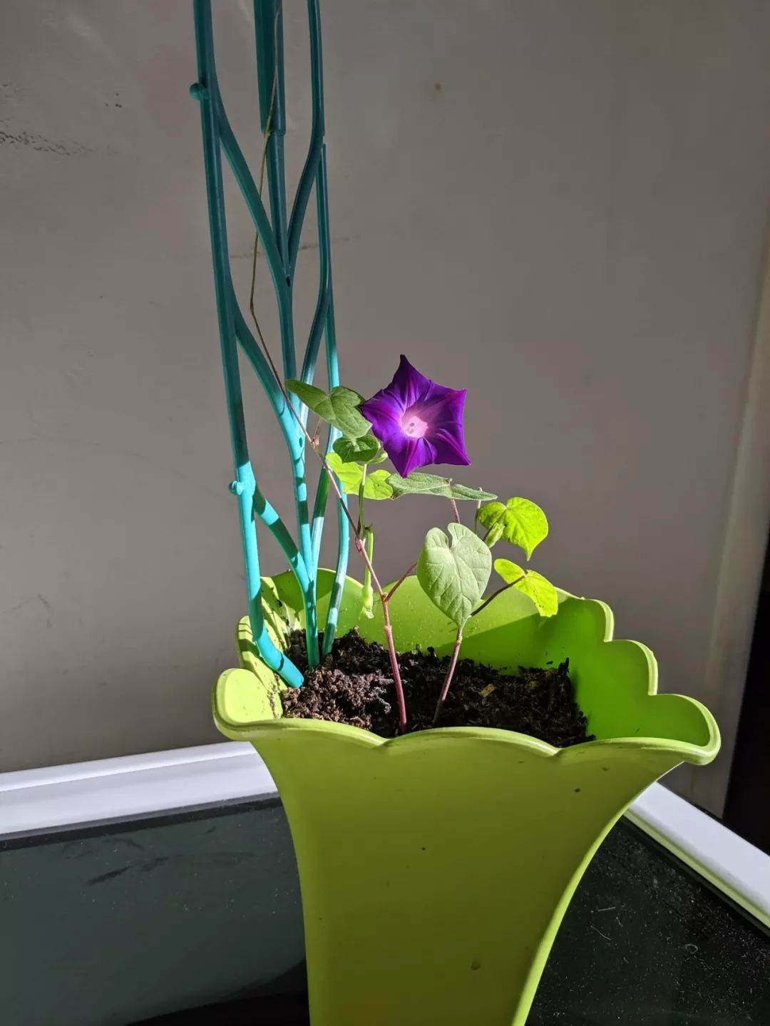 牵牛花长出4~5片真叶之后,就可以直接带土移栽到一个比较大的花盆里,或者直接种在户外阳光较多的地方。如果是温度较低的地方,还可以养成阳台和窗台上的爬藤植物。移栽后也不能养在过度遮阴处,给一点点阳光,逐渐增加光照,养护的环境要保持温暖,如果温度过低,会导致开花的时间延后。