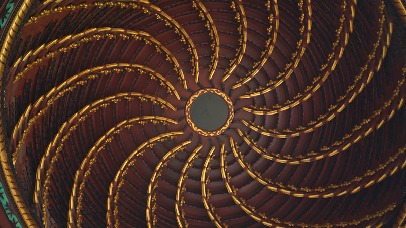 324只黑色蝙蝠浅雕,306颗金黄色云头圆雕,它们排列而成的18条金龙相依相绕,龙头向下衔住井沿,龙尾堆迭盘旋向上腾起,最终汇聚于藻井顶端的铜镜片上。