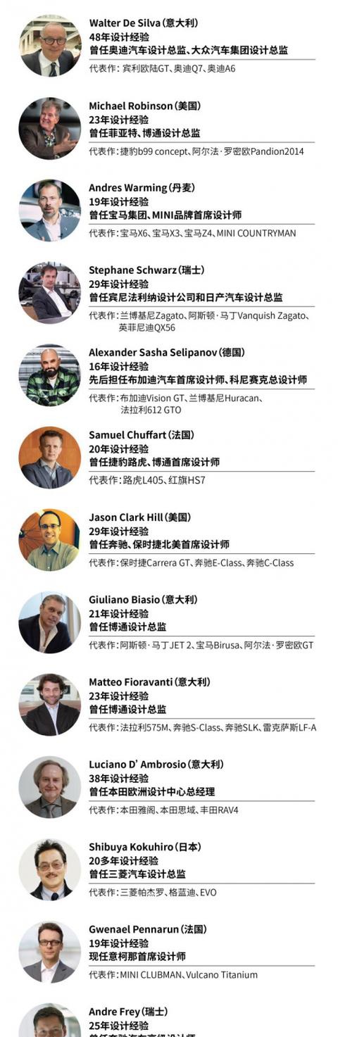 也就是说,恒驰要想确保颜值惊艳世界,就必须要由全球汽车造型设计界经验丰富的巨擘来操刀。下足功夫欲在新能源汽车行业大展拳脚的许家印,对此显然有着深刻的认识。此次签约的15位大师,就是恒大从全球50位大师的150个设计方案中层层筛选而来。入选的15位大师均是来自美国、德国、法国等汽车工业强国的汽车造型设计大咖,拥有数十年设计经验,为奥迪、大众、宝马、奔驰等全球知名车企打造出无数经典车型。