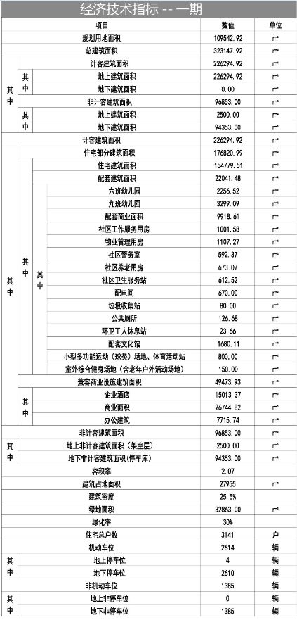 规划显示,项目规划用地面积109542.92平方米,总建筑面积323147.92平方米,计容建筑面积226294.92平方米,住宅部分建筑面积176820.99平方米,容积率2.07,建筑密度25.5%,绿地面积32863平方米,绿化率30%,住宅总户数3141户。项目包含一个6班幼儿园,一个9班幼儿园,配公用卫生间、垃圾收集站、文化馆、健身场所,1万方商业和1.5万方的酒店。