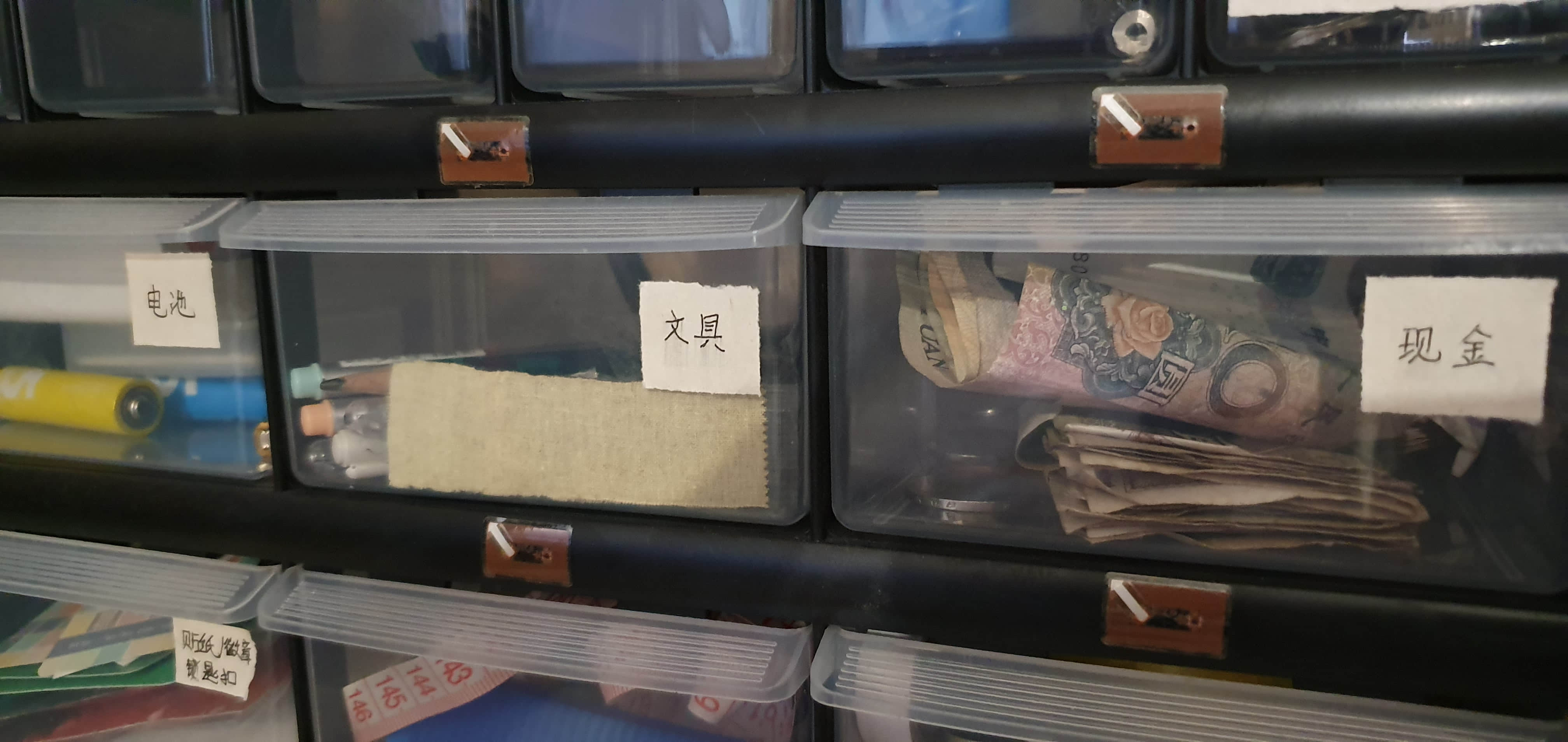 东西多自然得整理,有的人会按照分类将不同的东西放到不同的收纳箱里,但不是所有物品都能如此准确地分类,又需要用箱子来放分不了类的物品,最后要找某些分类不明显的东西时,依然想不起来它放在哪里;有的人更进一步,会给不同的收纳容器贴上标签,甚至还会用笔记本/备忘录记录下哪里都有哪些东西,比如我也有这样的工具箱: