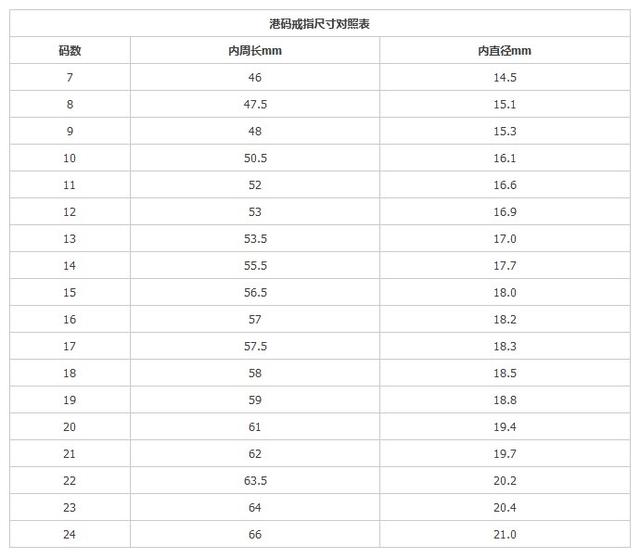 按照港版的戒指尺寸对照表来看,戒指尺寸共有7-24个号。7号戒指对应的内圈周长大概是46mm,戒指内直径大概是是14.5mm,随着戒指号数的增大,戒指的周长和直径也增加。一般女生的戒指尺寸是7-15号,大部分女生的戒指尺寸是在12号、13号左右。