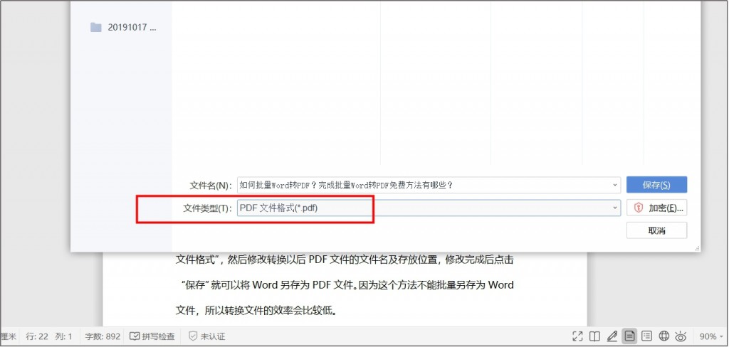 选择后界面会立即弹出另存为PDF的对话框,我们选择“保存类型”为“PDF文件格式”,然后修改转换以后PDF文件的文件名及存放位置,修改完成后点击“保存”就可以将Word另存为PDF文件。因为这个方法不能批量另存为Word文件,所以转换文件的效率会比较低。