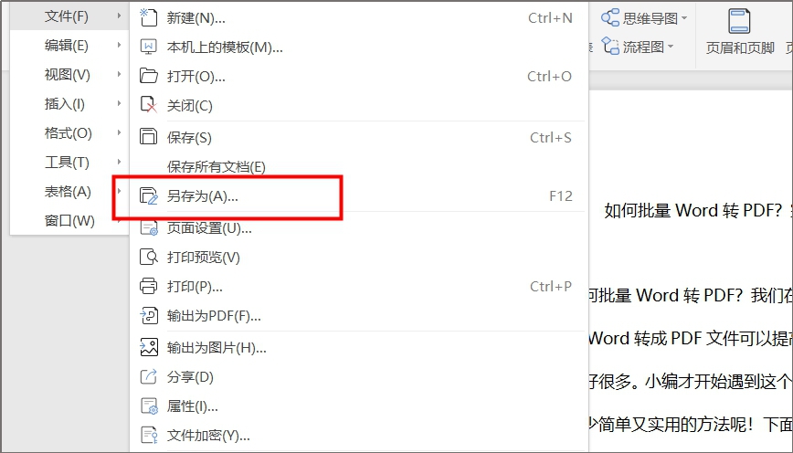 我们可以将Word另存为PDF文件。首先我们打开要转换的Word文件,然后点击上方的“文件”选择“另存为”选项。