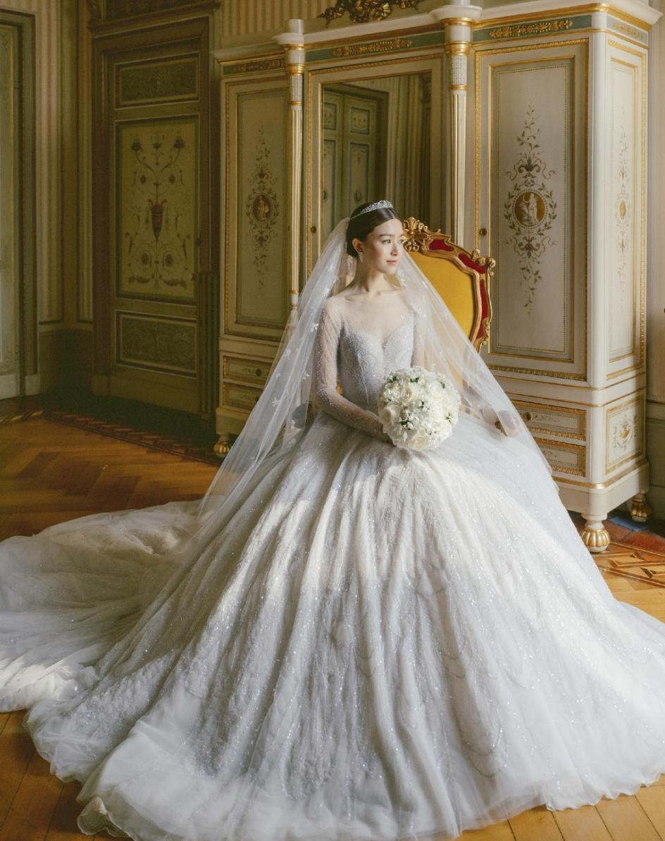 她的婚纱采用的是象牙白色丝绸材质,高贵典雅,端庄大气,领子和袖子的薄纱透视拼接,彰显朦胧美感,和白色头纱相得益彰,仙气飘飘,前面一排手工纽扣,非常别致又带着几分复古气息,优雅的一字肩领,展现出她完美的“天鹅颈”,气质女神范儿十足,散发着迷人魅力。