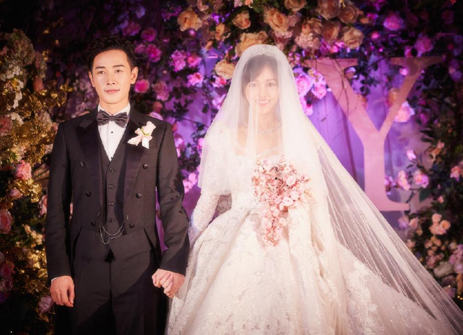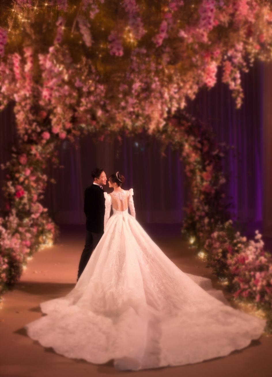 陈妍希的婚纱也很仙很甜,薄纱、蕾丝、刺绣,飘逸又带有风情魅力,梳着简单的丸子头,清爽利落,粉色花朵发饰点缀,少女感十足。