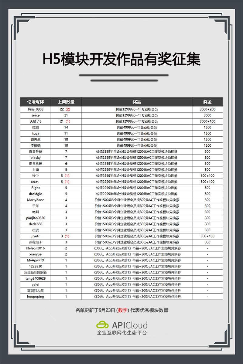 如今在APICloud的模块Store生态池中,涌现了大量的功能丰富的H5模块,这一定离不开平台开发者们对APICloud的大力支持和偏爱,而柚子君也将回馈以丰厚的奖励奖金作为鼓励,以下战报获奖的开发者将陆续收到我们邮寄出去的京东现金卡、官方书籍和各种平台服务。
