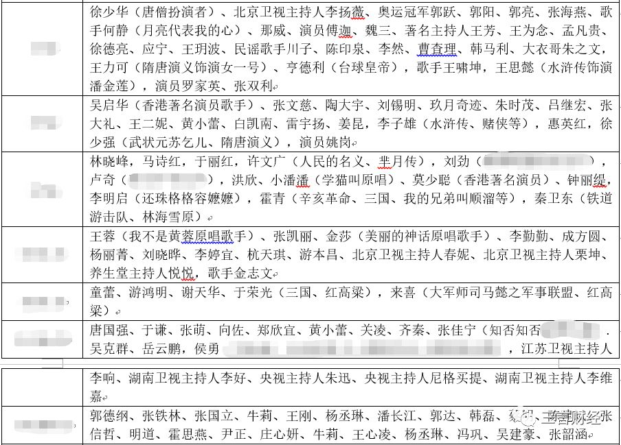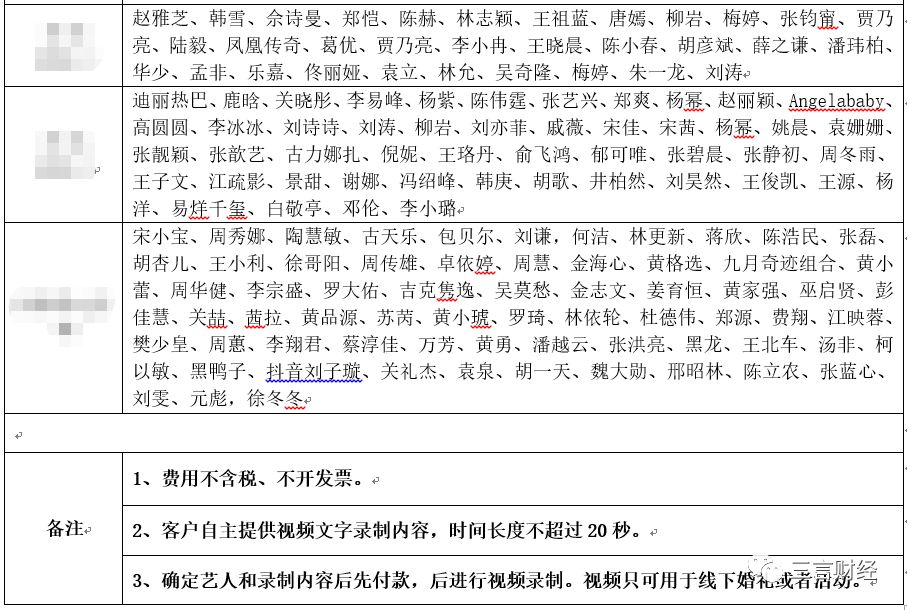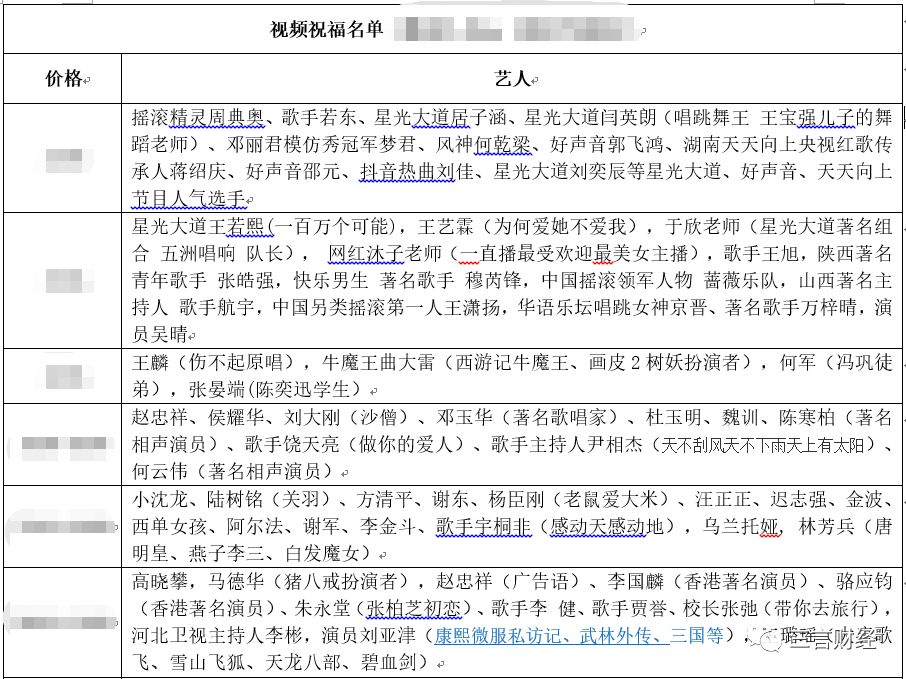 此外,三言财经还从中介处获得的一份明星视频祝福名单。