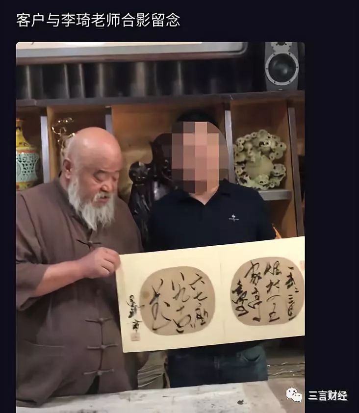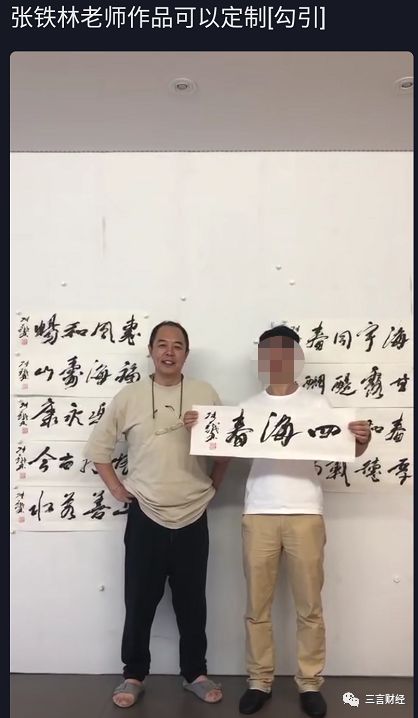 三言财经向其中一位商家咨询得知,他们还出售张铁林、朱军、李琦、毕福剑等名人的书画作品,并提供合影机会。在其拍摄视频中,也确实见到了张铁林、李琦等人与“客户”的合影。