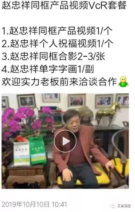 在微信群中,三言财经也发现了有人在售卖赵忠祥同框产品视频VCR套餐,套餐内容包括赵忠祥同框产品视频、个人祝福视频、同框合影、单字字画等。