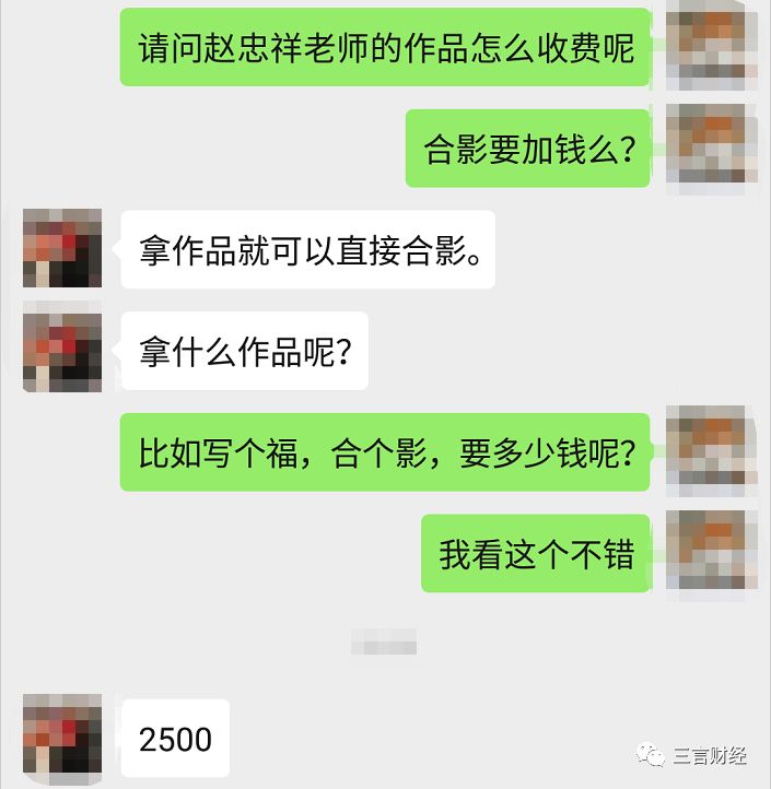 另一位卖家则表示,赵忠祥的作品只要买作品就可以合影,写一个福字并合影,只要2500元。