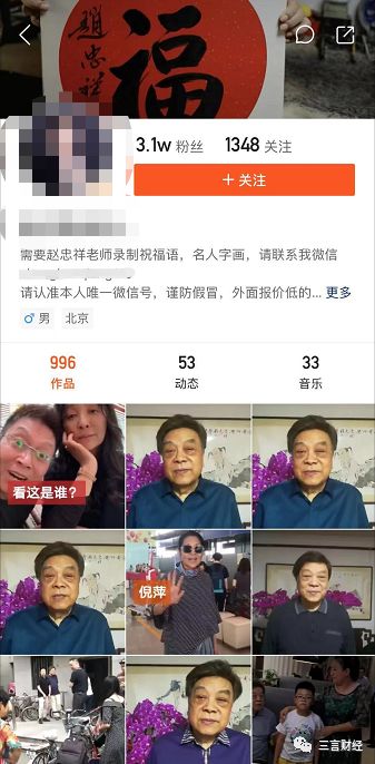 今日有媒体曝出花4000元跟赵忠祥合影,而三言财经在短视频平台上亦发现大量售卖赵忠祥合影、字画、祝福视频的商家。
