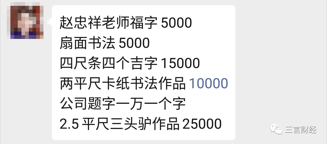 上述卖家称,赵忠祥的作品福字5000元,扇面书法5000元,四尺条四个吉字15000元,两平尺卡纸书法作品10000元,公司题字一万一个字,2.5平尺三头驴作品25000元,只合影也要5000元。