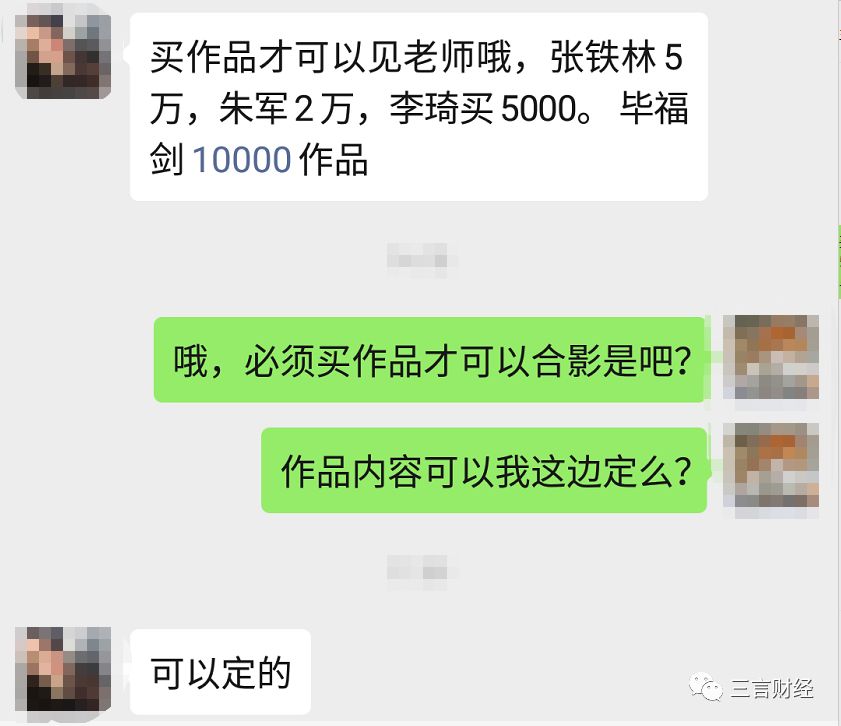 商家表示,必须买作品才能合影,作品的价格是张铁林5万,朱军2万,李琦5000, 毕福剑1万,作品内容可以买家自己定。