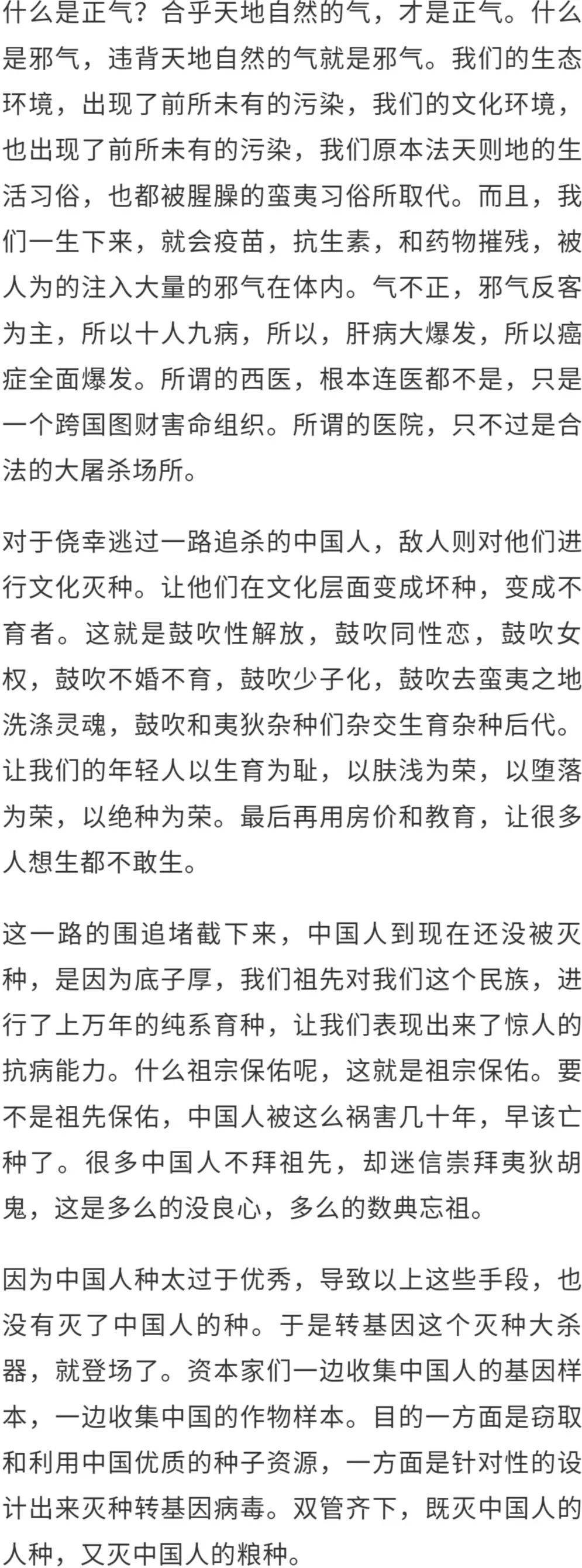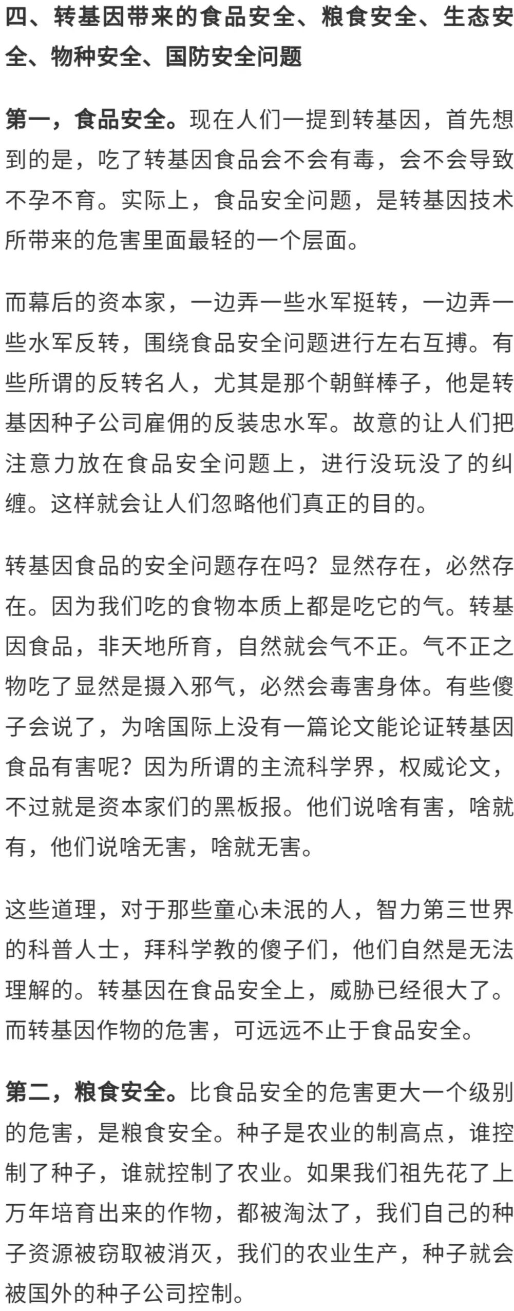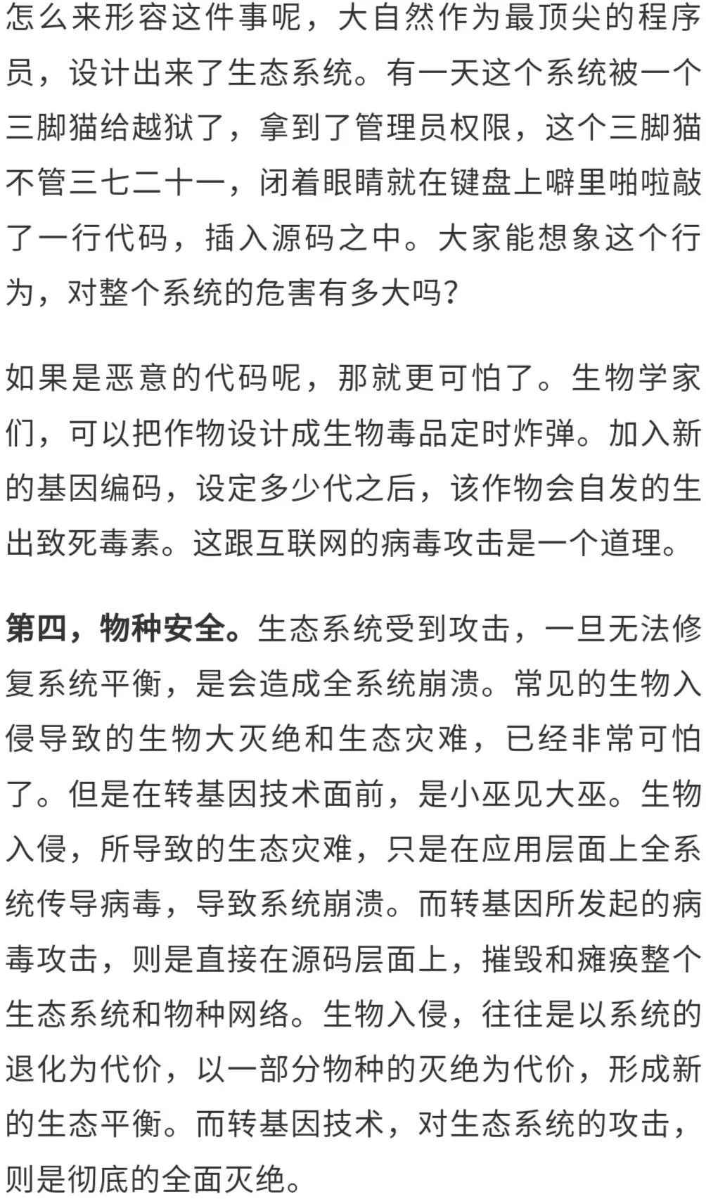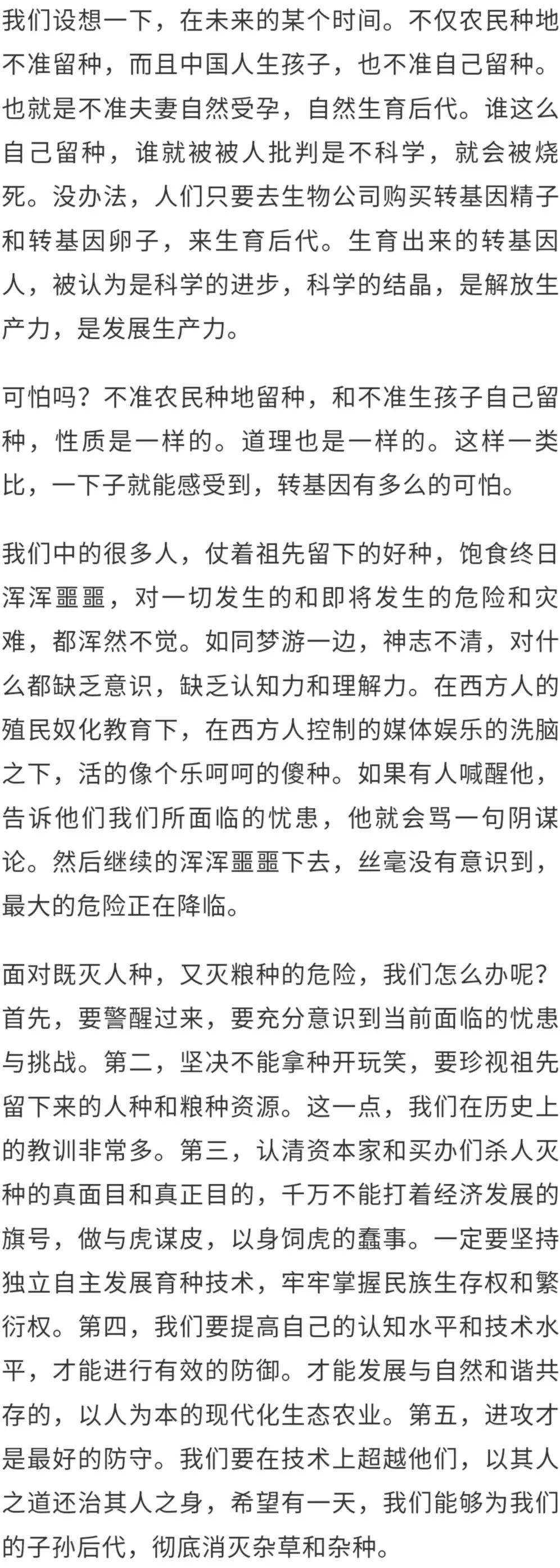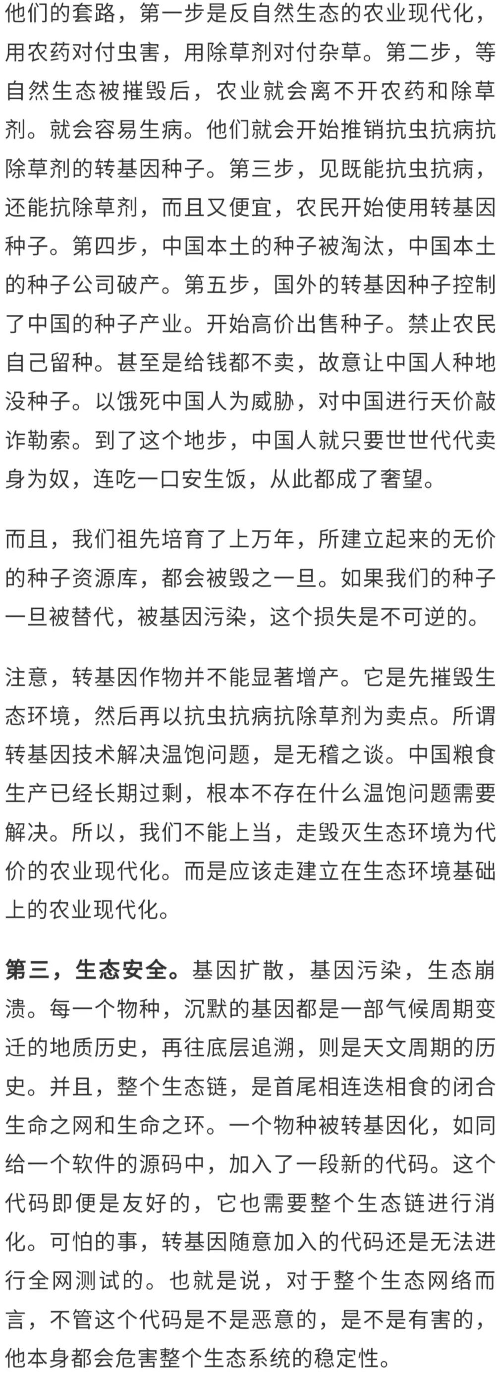 转基因技术,作为一种极端非常规育种模式,它用基因工程的手段,把不同的种之间,强行进行拼接,形成新种。它意味着什么呢?恐怕不只是对作物的改种育种这么简单。而是意味着,转基因技术,是对之前所有人类文明和生态文明的彻底摧毁。在转基因的统治中,不再有天,不再有人,不再有文明,而只有资本。