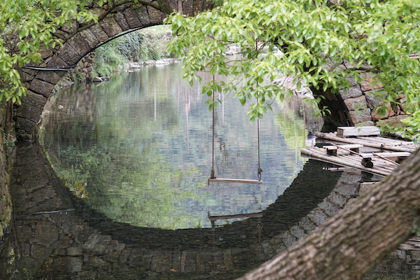 这座桥,据说建造于清雍正年间,是从王化前往绍兴城和杭州的必经之所。乱石叠砌成的圆拱石桥最符合山的野性。每一块石头都相互紧锁着,构成一个紧密的整体。桥旁的古樟树在明镜般的溪流上投射出它碧翠的幻象,搅动得水面好似浮草连绵。桥旁的人家在横斜的枝干上吊下了一块木板,并以“溪上秋千”冠名。若想坐到秋千上一尝滋味,便需亲自划动岸边的竹筏前往。青碧的水色,虚实相乘的石拱,浓荫密布的古树和静候佳人的秋千,构织成的氛围就像桃源梦境一般。城里人闻风赶来,拍照合影,留下不虚此行的印象 。于是久而久之,此处渐渐声名鹊起。桥旁的人家也因为游客络绎不绝而开起了小饭店。水里的溪鱼,山里的农家菜,就着杨梅烧酒,吃得令人痴痴沉醉。