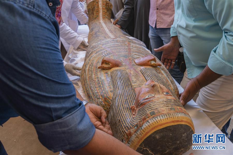 这是10月19日在埃及卢克索拍摄的近期发掘出的棺椁。埃及文物部19日在南部城市卢克索举行的新闻发布会上宣布,埃及考古队近期发掘出30具3000年前的木质棺椁。新华社记者李碧念摄