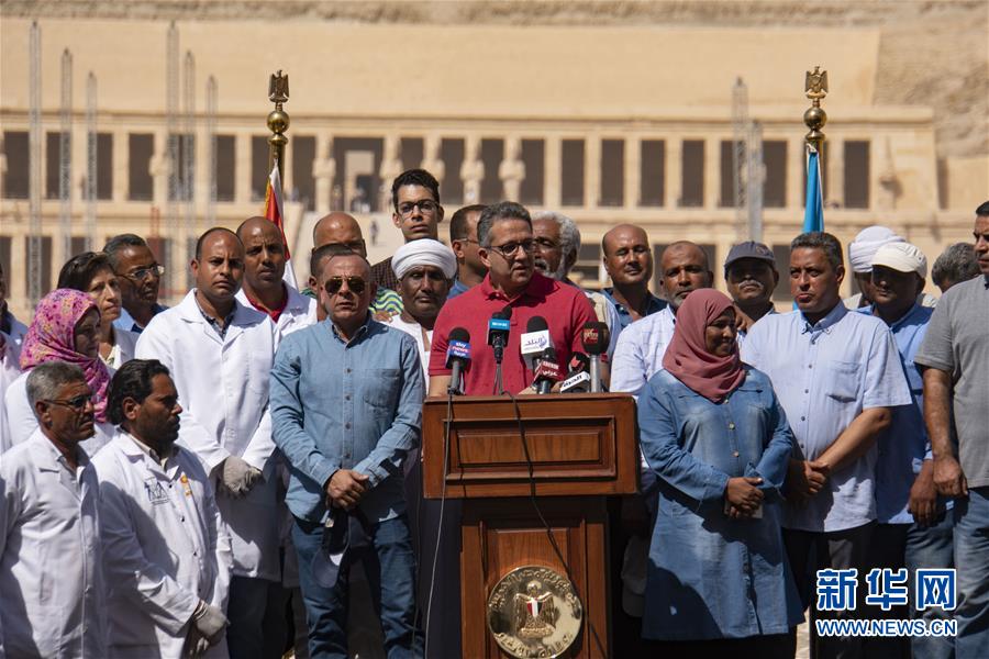 10月19日,在埃及卢克索,埃及文物部长哈立德·阿纳尼在新闻发布会上讲话。埃及文物部19日在南部城市卢克索举行的新闻发布会上宣布,埃及考古队近期发掘出30具3000年前的木质棺椁。新华社记者李碧念摄