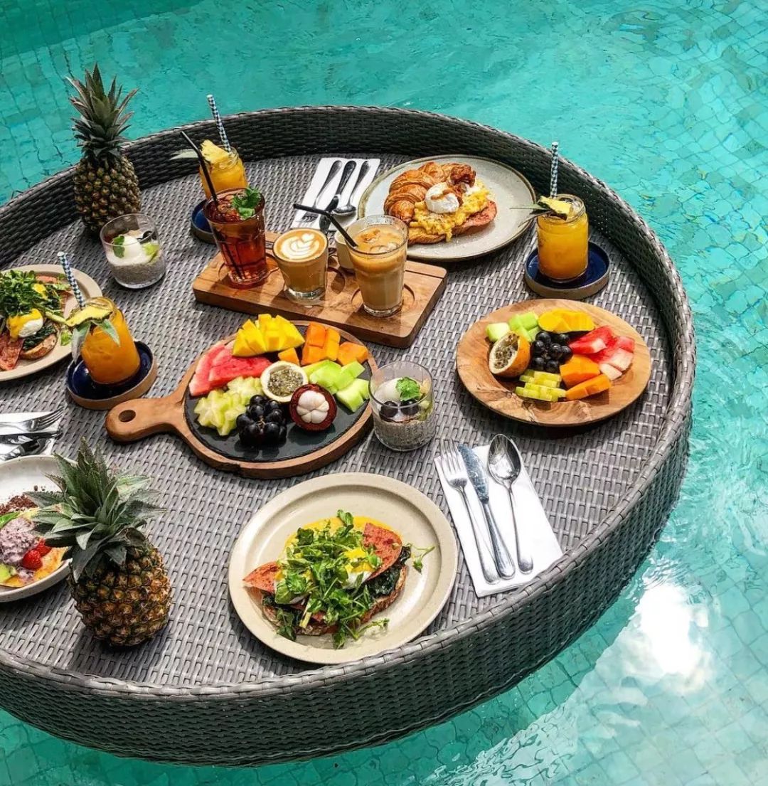 这里主打的漂浮早餐,一共有4个套餐可以任选,可点单人份或者双人份,可以边游泳边吃,也可以直接放到台面吃均可。漂浮早餐种类众多,有菠萝汁、冰咖啡、烤香蕉、面包、沙拉、汉堡,还有冰淇淋等。