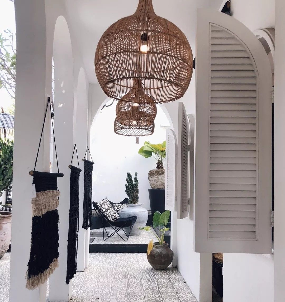 整个建筑就像是一座法式小洋楼,纯白的色调,散发着北欧简约干净的美感, 大量编制制品,也运用地恰到好处。