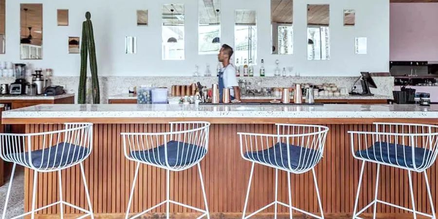 餐厅的设计简约清爽,一个巨大的泳池将餐厅分隔两边,大量的仙人掌装饰,让整个色调变得年轻鲜活,爬上二层还可以看到远处的风景,餐厅播放着流行的欧美歌曲,让人不自觉以为来到了一个电音派对,非常有氛围。