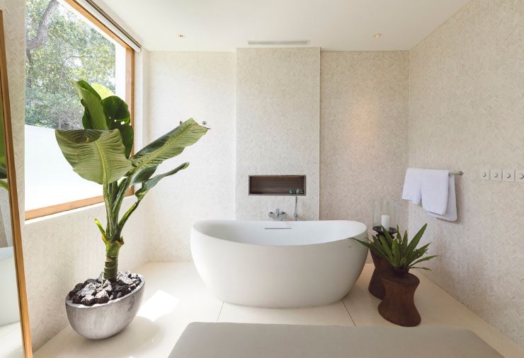 别墅主卧套房面朝大海,在被藤蔓覆盖的露台上,可以尽情享受一览无余的美景。主卧配备带巨大浴缸、花洒淋浴和配套梳妆台的连接浴室,其中2间次卧共享一个海景露台。