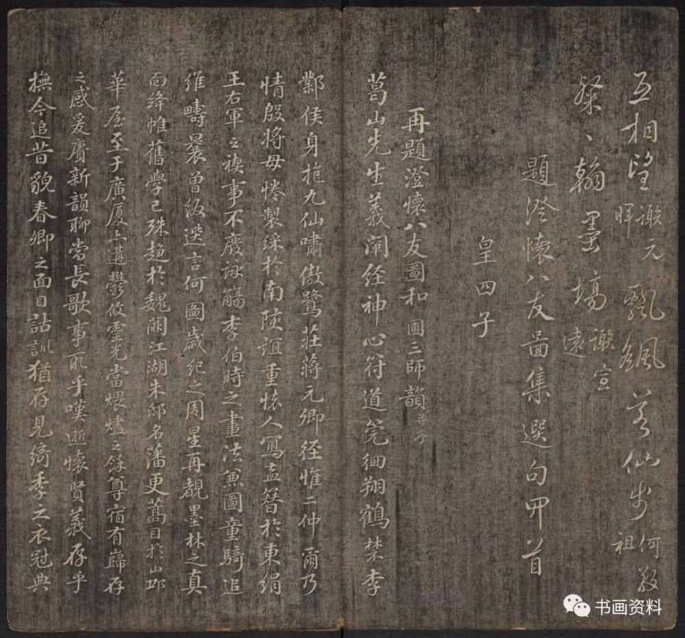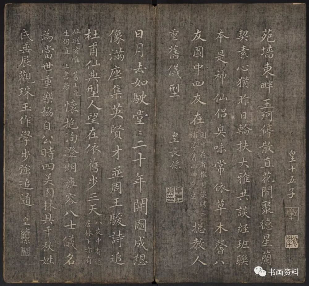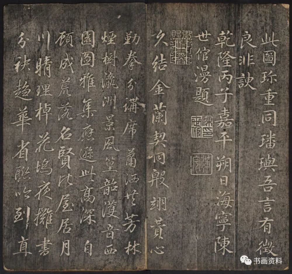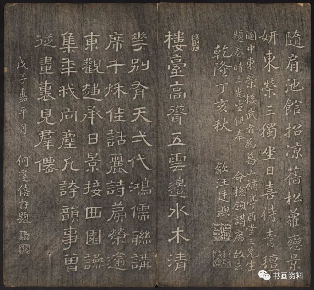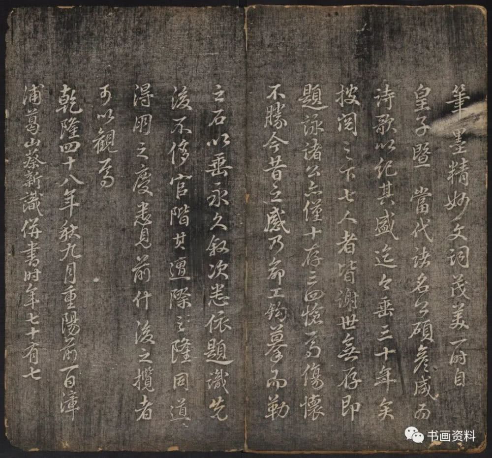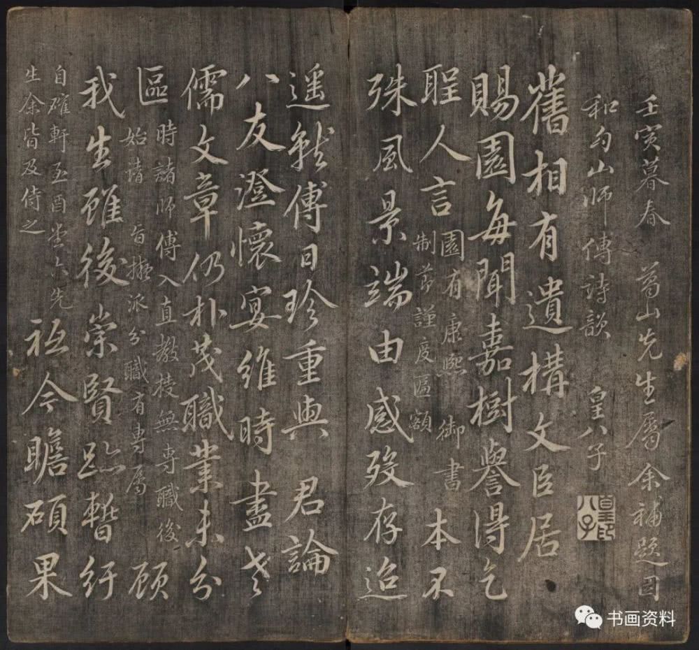 此《延禧堂忆旧帖》分上下卷。上卷前列汪由敦序、《澄怀园八友图》、诸皇子皇孙书法。下卷为雍正、乾隆年间重要书家陈世倌、刘统勋、金德瑛、董邦达、王际华、蒋溥、周景柱等十九人所题诗。末有蔡新自跋,记述了诗帖形成始末。
