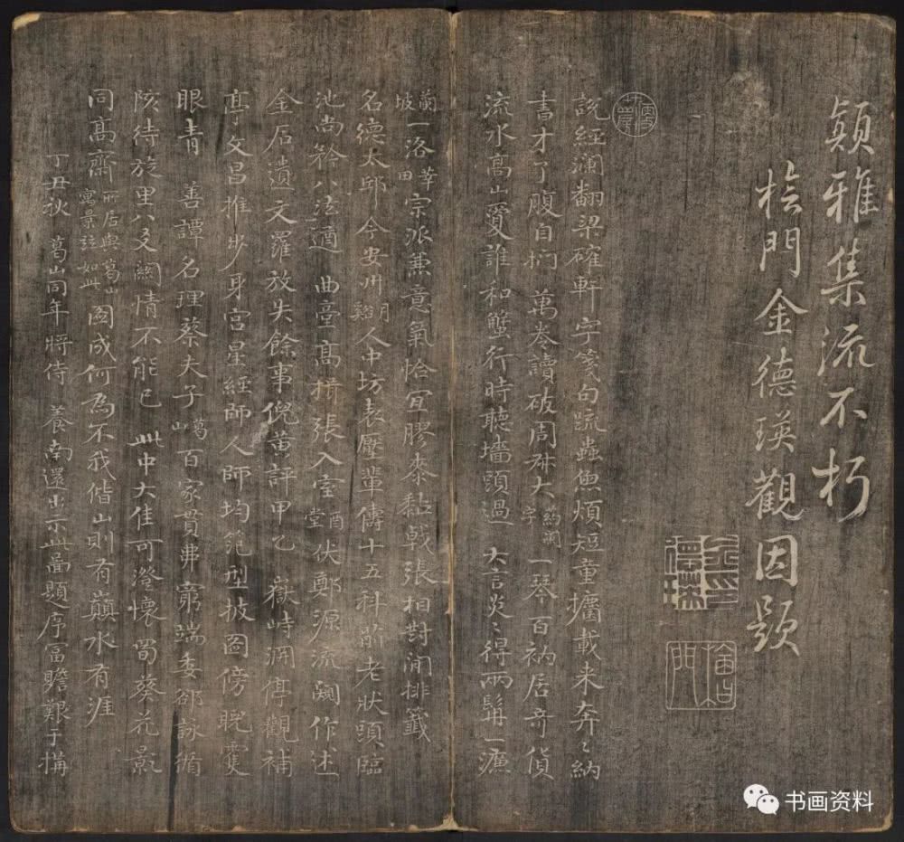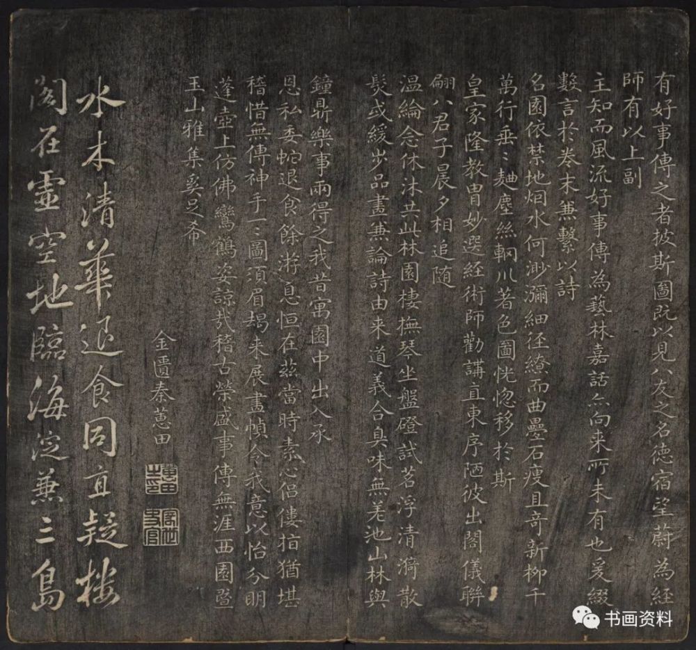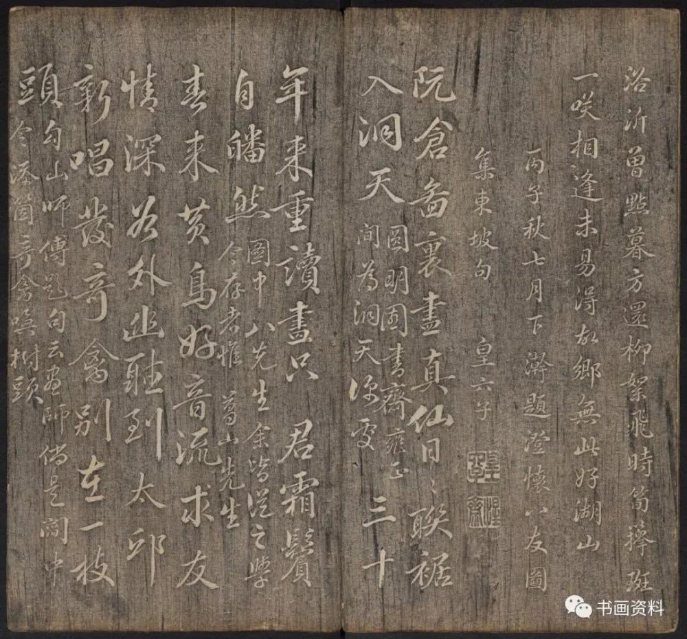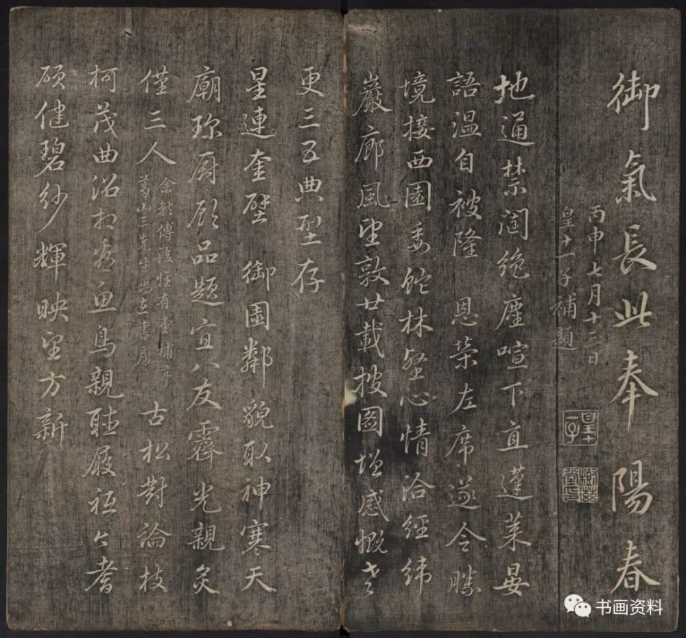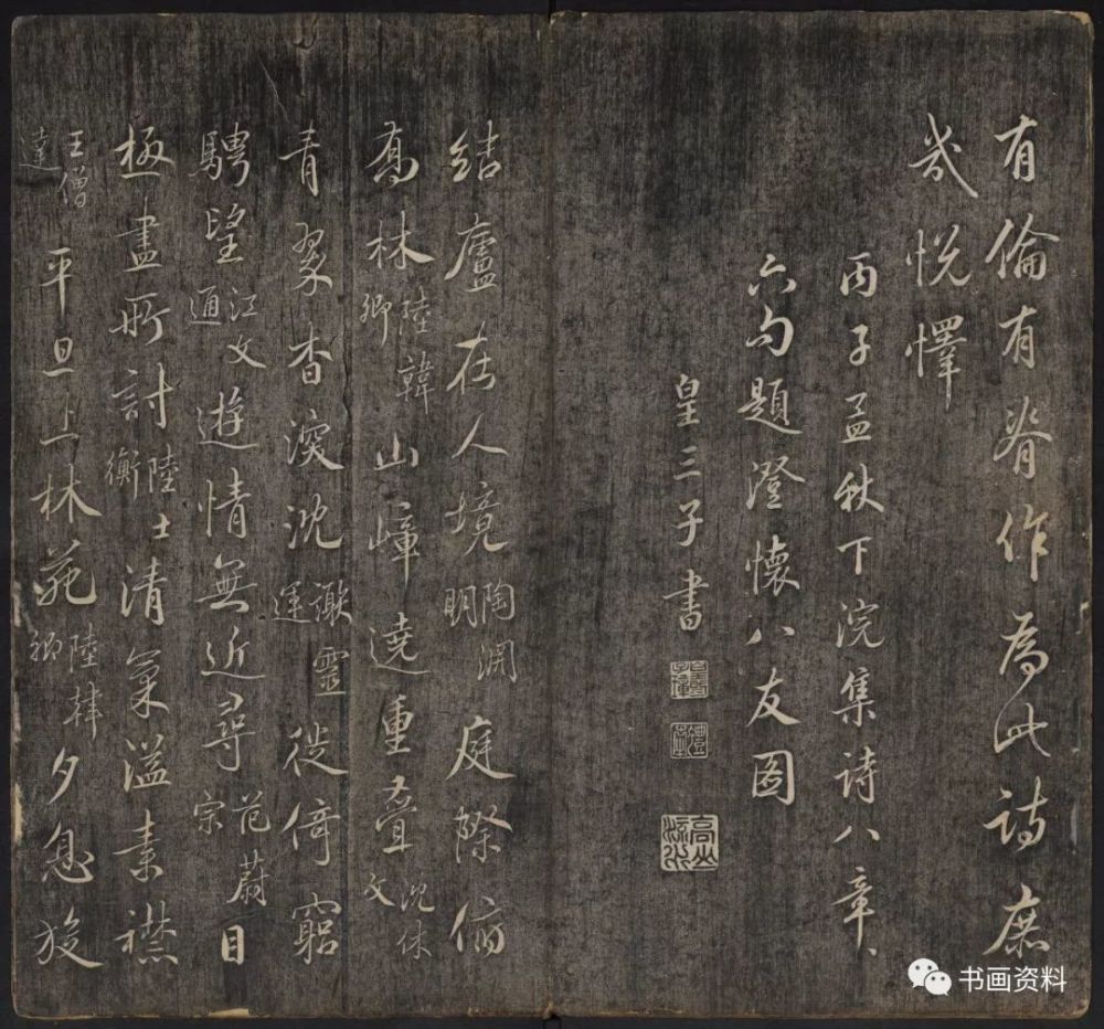 此《延禧堂忆旧帖》分上下卷。上卷前列汪由敦序、《澄怀园八友图》、诸皇子皇孙书法。下卷为雍正、乾隆年间重要书家陈世倌、刘统勋、金德瑛、董邦达、王际华、蒋溥、周景柱等十九人所题诗。末有蔡新自跋,记述了诗帖形成始末。