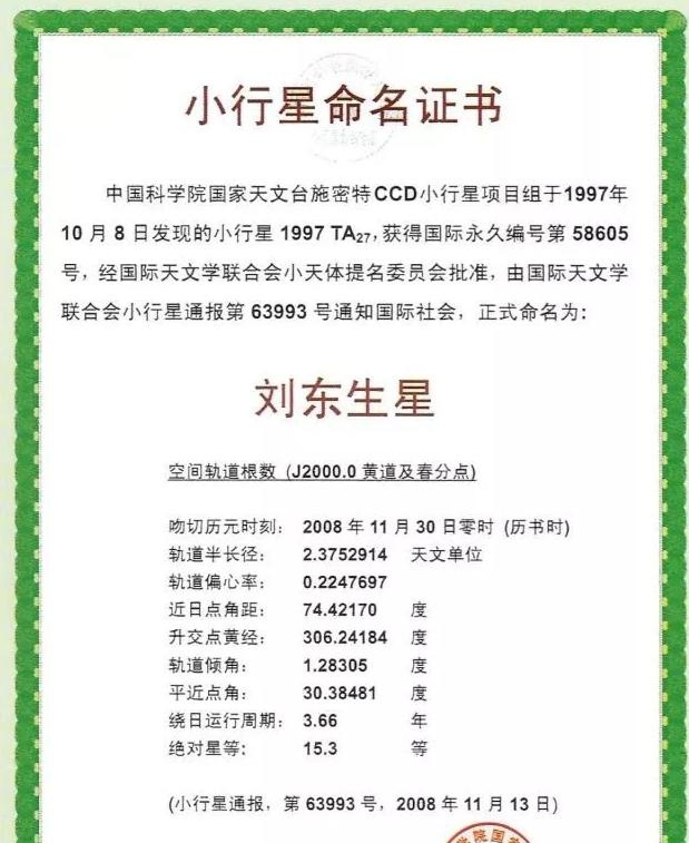在先生逝世一周年之时,国际天文学联合会小天体提名委员会于2008年批准,将国际永久编号第58605号小行星1997TA27命名为"刘东生星",承载着刘东生学术思想和科学精神的天体永远遨游寰宇,光耀苍穹。