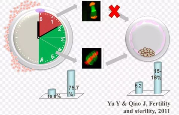 人卵母细胞在胚胎第8周时就开始第一次减数分裂,出生时初级卵母细胞已经过第一次减数分裂前期,在酪氨酸激酶配体(tyrosinekinaseligand,KL)/c-kit基因编译受体信号途径、细胞静止因子(cyto static factor,CSF)、环磷酸腺苷(cAMP)的作用下,长期停留在前期和中期之间的静止期;直至青春期在适当激素环境下,引发原来静止的减数分裂重新恢复,完成第一次减数分裂,形成次级卵母细胞和第一极体;次级卵母细胞于排卵前停留在第二次减数分裂中期,受精后完成第二次减数分裂。卵母细胞成熟的调控并不是一个单纯的级链式作用,而是一个非常复杂的多因子调节过程。