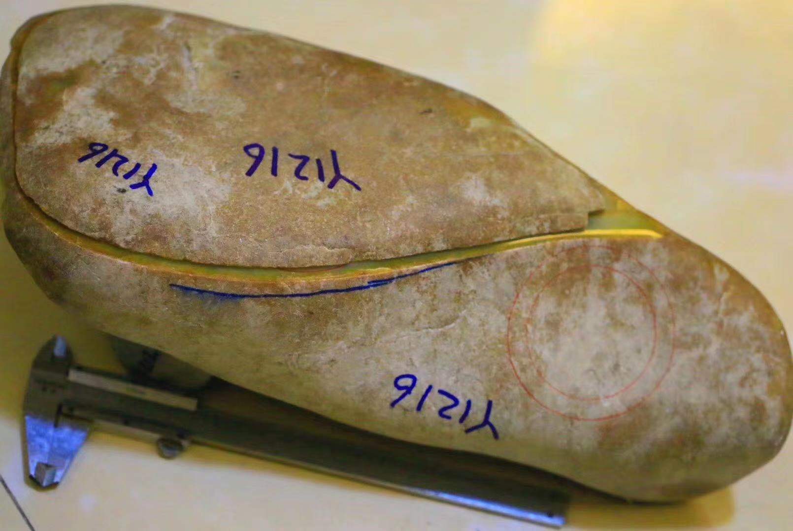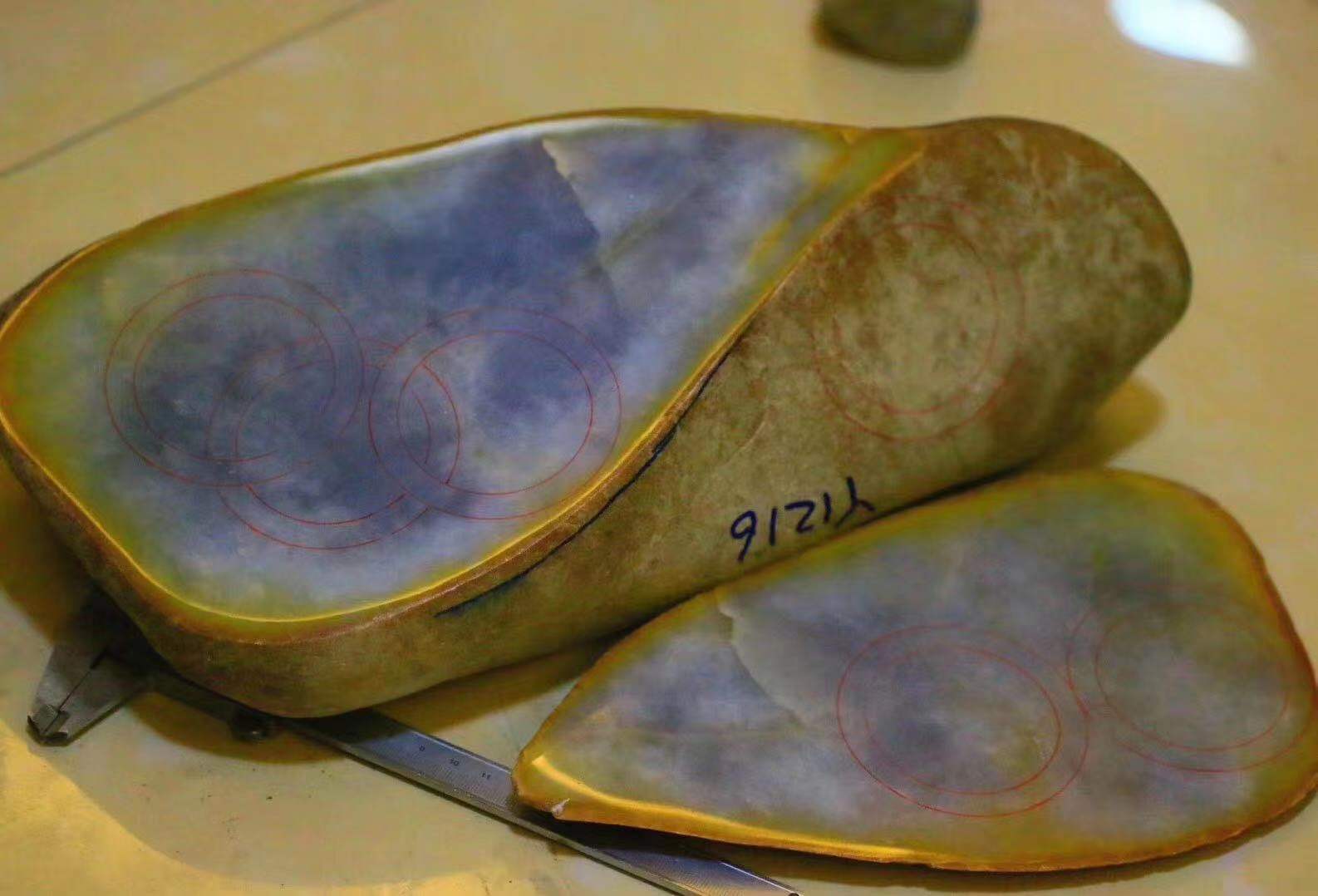 (6)大马坎翡翠原石的皮壳下全部都有雾层的出现,雾层的颜色有红色、黄色、黑色、白色等,大马坎翡翠毛料场口地子呈灰色,黄色、白色雾层的原石质地通常比较好。大马坎翡翠赌石有“十雾九水”的说法,大马坎赌石的皮壳颜色有褐,红,黄,灰等颜色,不常见腊皮壳。