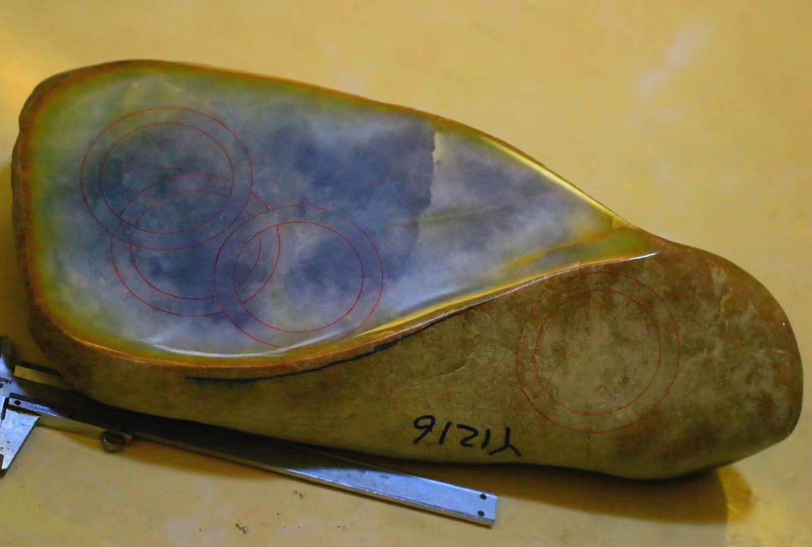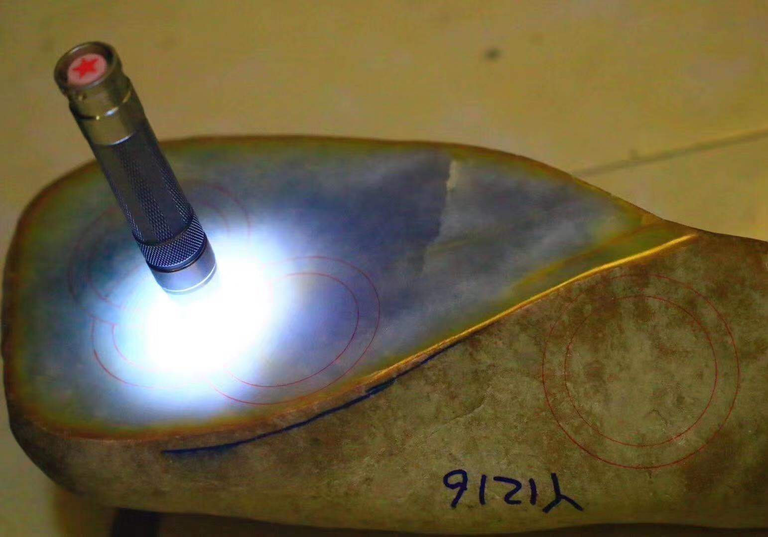 (2)大马坎原石很受赌石爱好者欢迎,因为出所谓“黄夹绿”,很多初学者用手电筒去看,超级漂亮,误认为这是冰种、玻璃种,其实灯光下的黄色是翡翠皮壳下的雾,并不是真正意思上的黄翡。