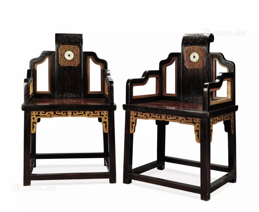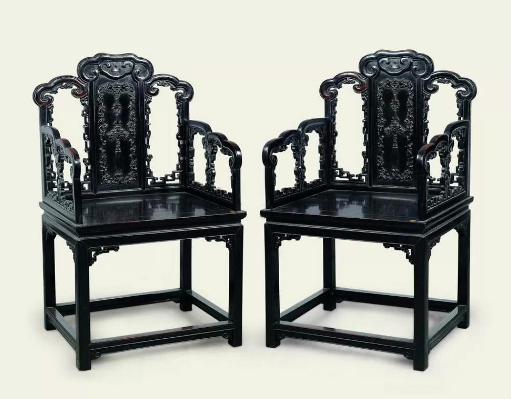 中国太师椅拍卖榜第7名 清乾隆 大漆嵌竹黄卷书式搭脑太师椅 (一对)