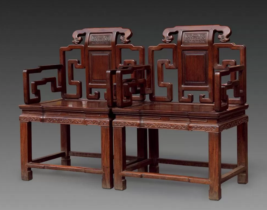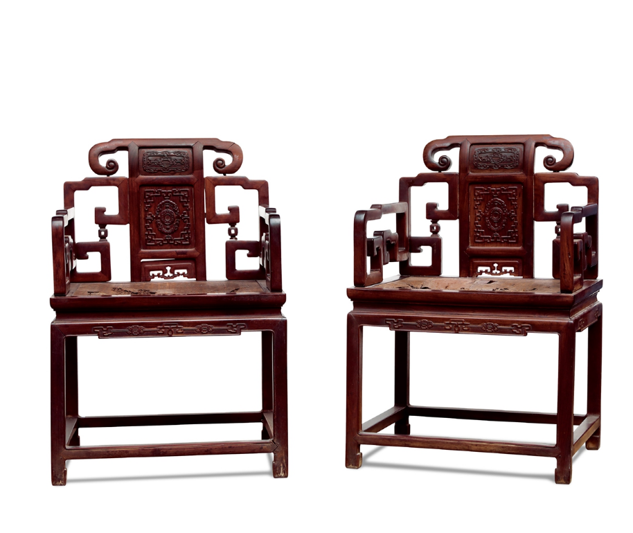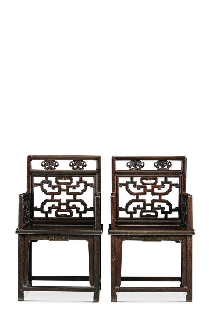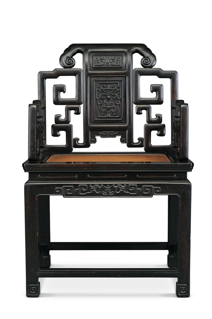 靠背板上雕蝠磬纹,寓“福庆”之意,搭脑,立柱透雕卷云纹,与背板相连,背板与立柱的内边均透雕拐子纹,两侧扶手婉转而下,成卷云状。扶手中间透雕立瓶式拐子纹,座面下束腰并透雕拐子纹角牙,腿间安有四面平管脚枨。