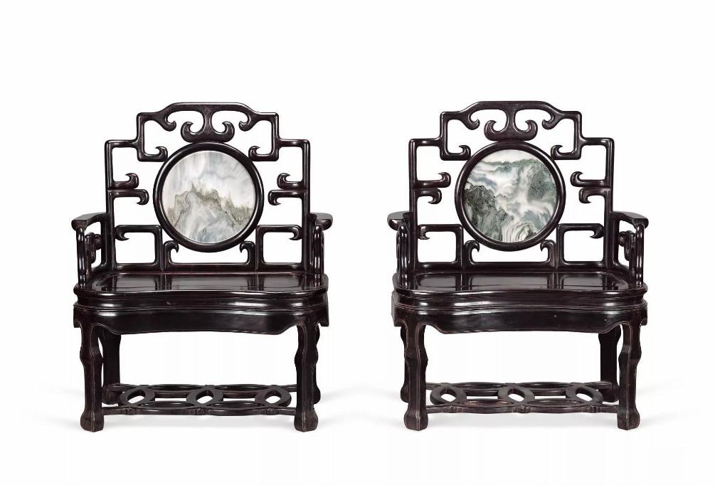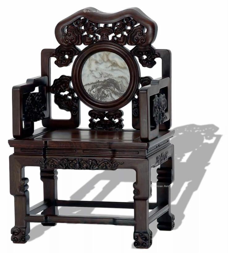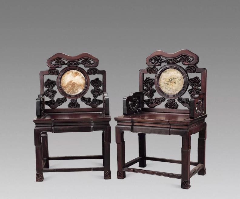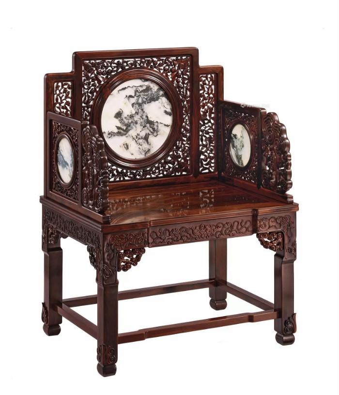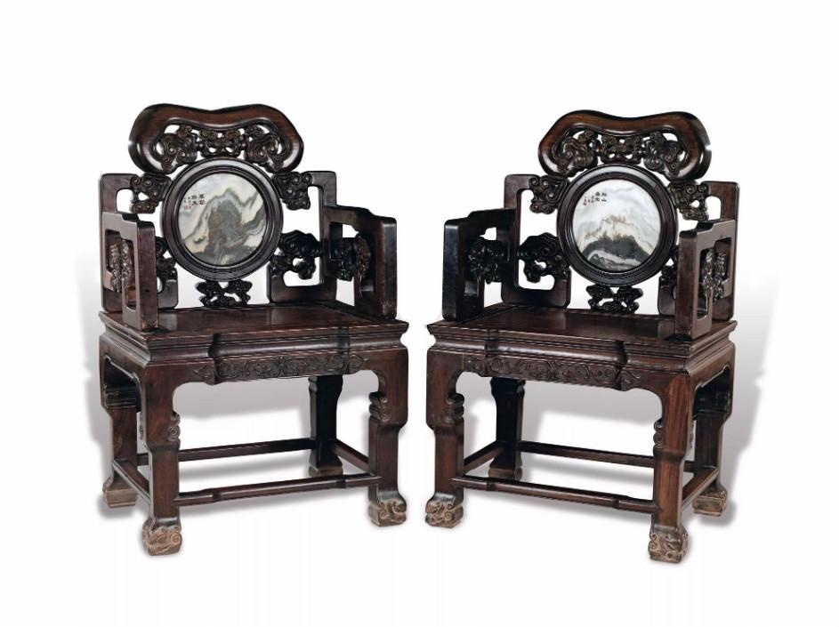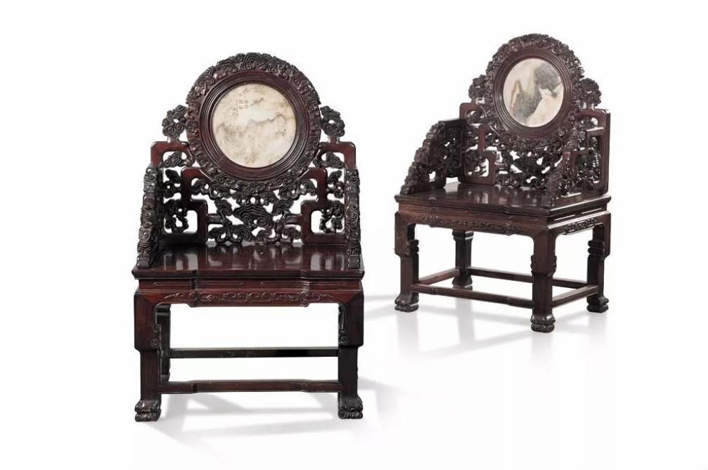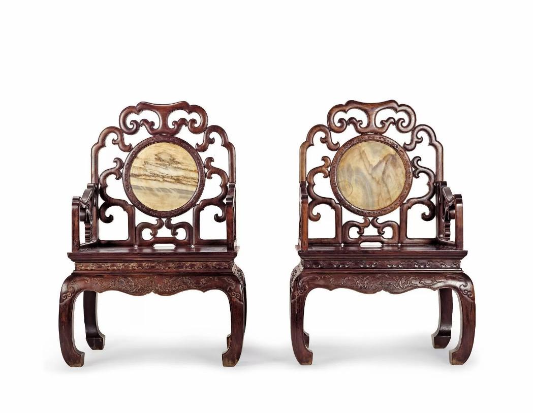 中国太师椅拍卖榜第12名 清中期 红木嵌大理石灵芝纹太师椅成对