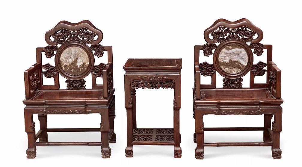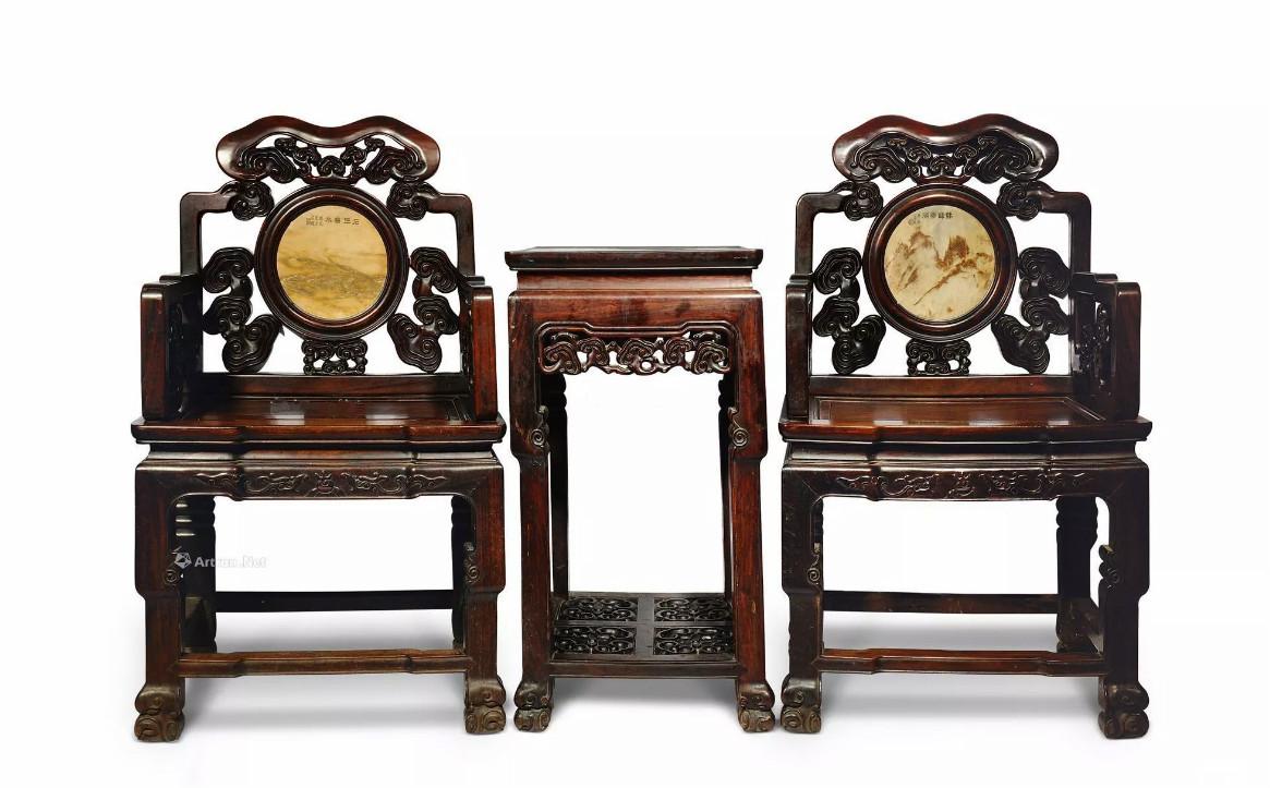 中国太师椅拍卖榜第24名 民国 红木灵芝纹嵌云石太师椅 (两椅一几)